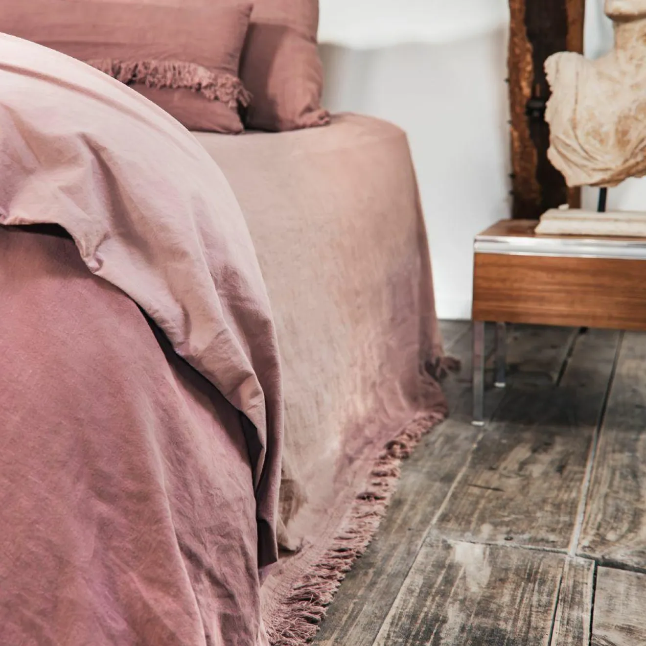 Le couvre-lit GANG, coloris Rosebud, en 100 % lin lavé, apporte une touche douce et chaleureuse à votre chambre. Sa texture naturelle et légère garantit un confort optimal, tout en créant une ambiance apaisante et élégante. Avec des dimensions de 250 x 250 cm, il est parfaitement conçu pour recouvrir un lit et ajouter une note raffinée à votre espace. Les finitions frangées et la croix brodée à l’angle ajoutent des détails subtils et sophistiqués, tout en accentuant le charme intemporel de ce modèle. Le coloris Rosebud, délicat et chaleureux, s’intègre harmonieusement dans des décors modernes ou classiques.
