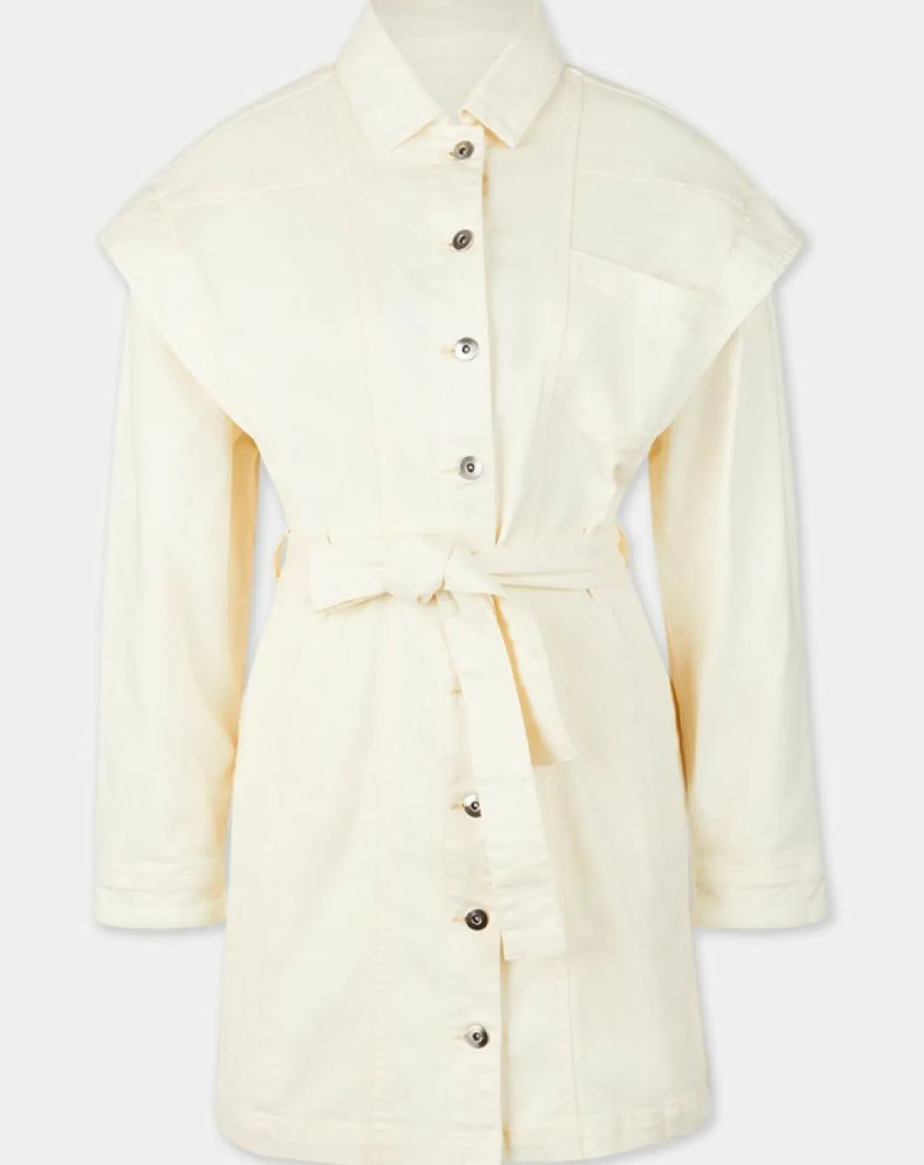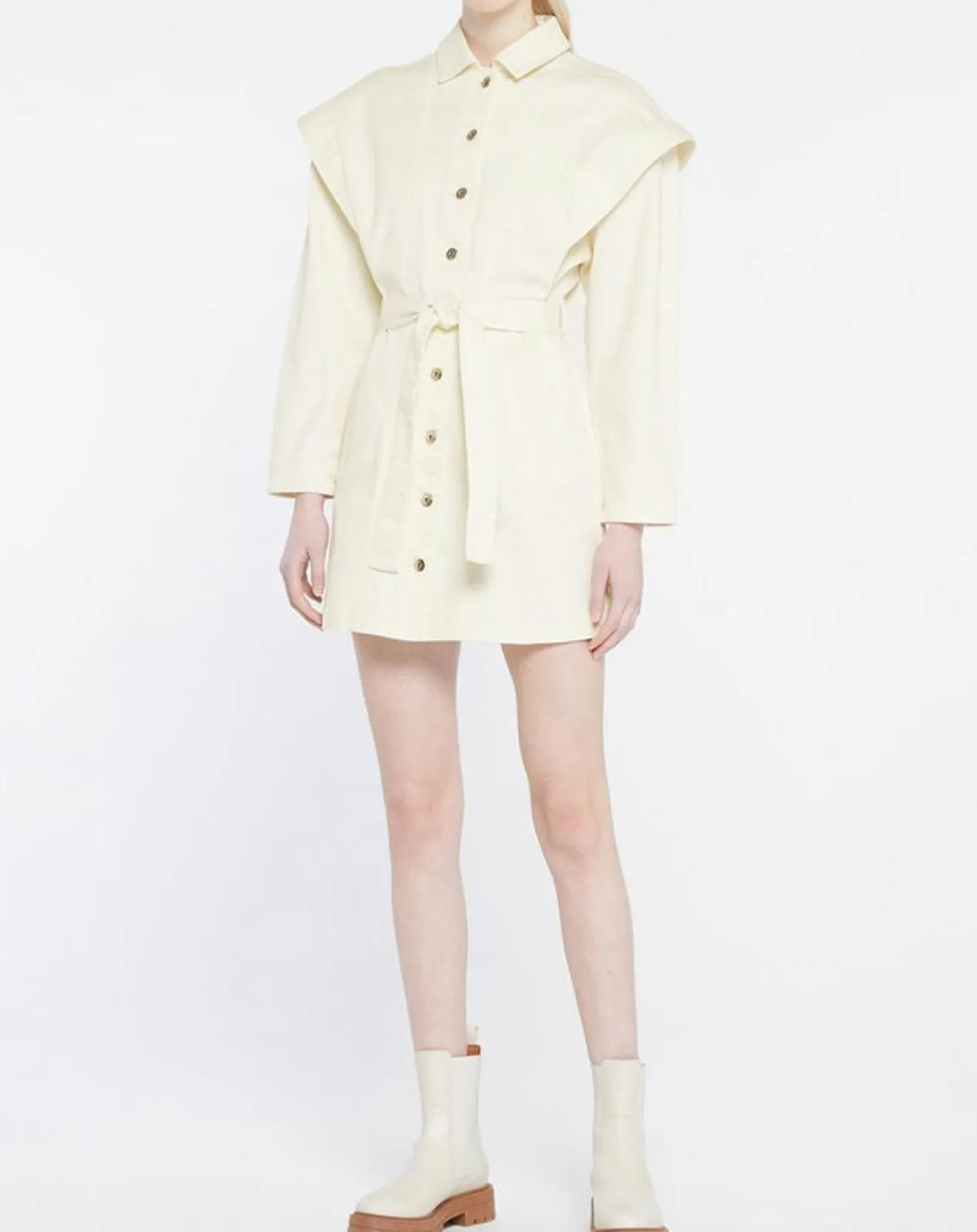 Cette robe courte Galeries Lafayette en coton jean est munie d’un col classique, d’une fermeture boutonnée métallique, de poches, de parements aux emmanchures et d’une ceinture à nouer.
