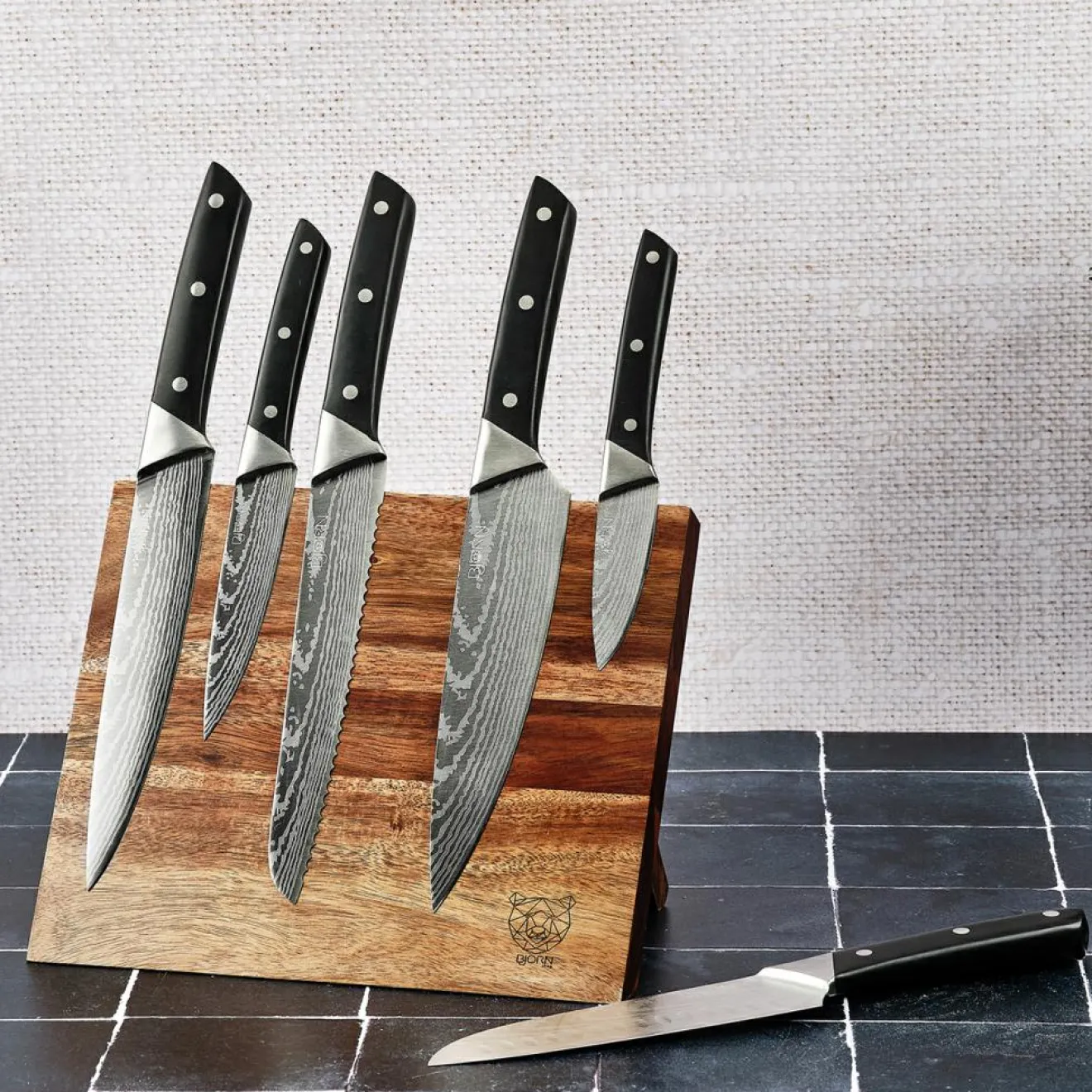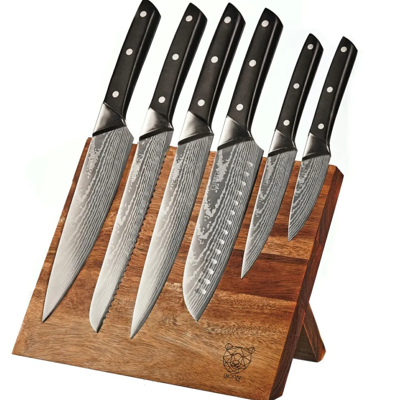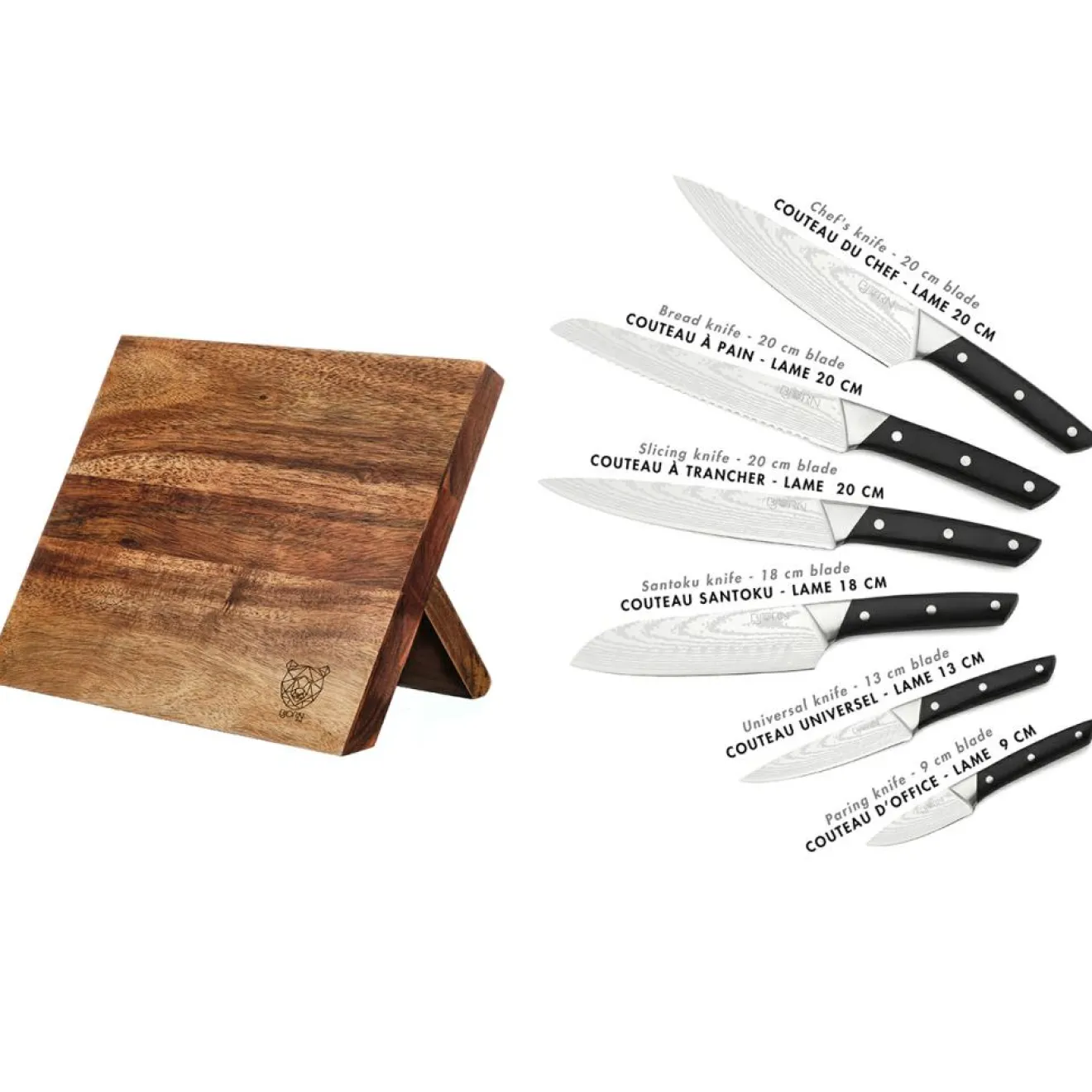 – Fabriqué en acier inoxydable finition satinée effet damas et poignée ABS (couteaux) – bois d’acacia (bloc)