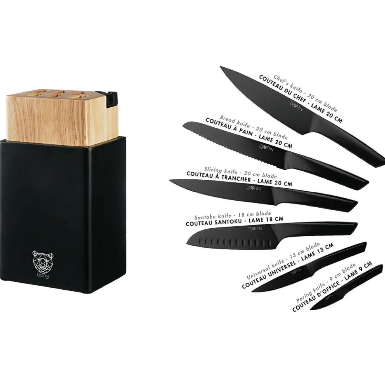 – Contient 1 couteau d’office (lame 9cm) + 1 couteau universel (lame 13cm) + 1 couteau Santoku (lame 18cm) + couteau à trancher (lame 20cm) + 1 couteau à pain (lame 20cm) + 1 couteau chef (lame 20cm) + 1 bloc couteaux avec aiguiseur intégré