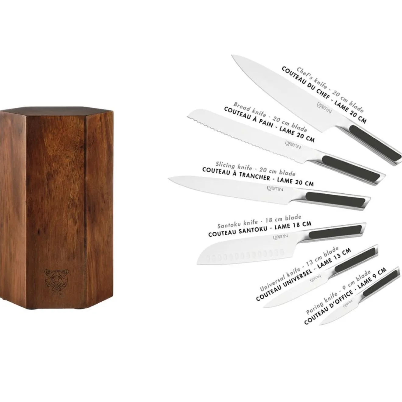 – Contient 1 couteau d’office (lame 9cm) + 1 couteau universel (lame 13cm) + 1 couteau Santoku (lame 17cm) + couteau à trancher (lame 20cm) + 1 couteau à pain (lame 20cm) + 1 couteau chef (lame 20cm) + 1 bloc couteaux universel magnétique