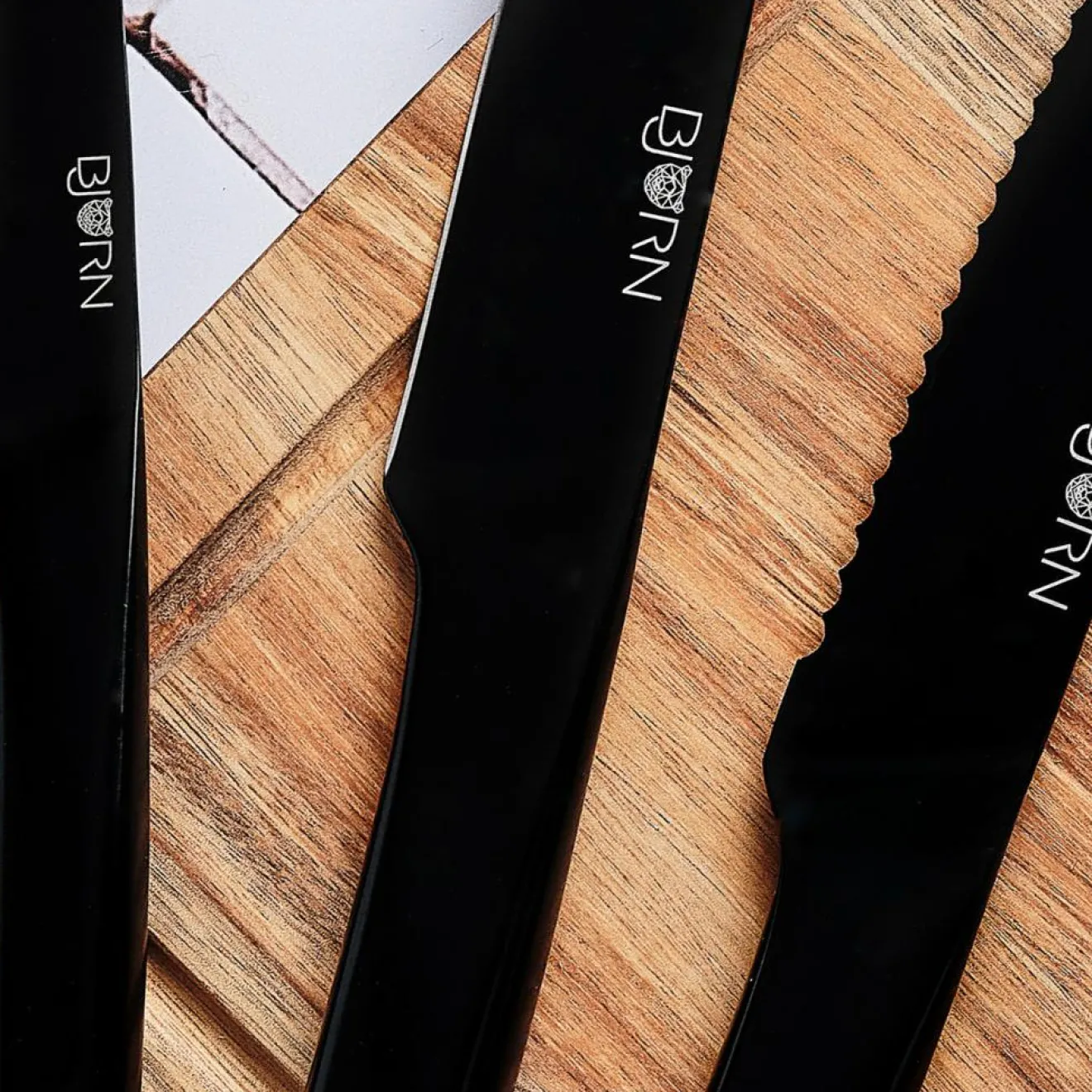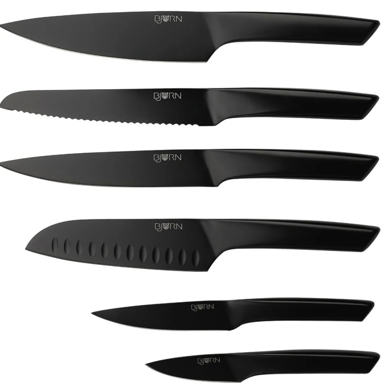 Le set se compose d’un couteau d’office pour couper et peler, d’un couteau universel très polyvalent, d’un couteau santoku pour les herbes aromatiques, les fruits et les légumes (les aliments ne restent pas collés à la lame grâce aux alvéoles), d’un couteau à trancher pour couper les viandes sans les déchirer, d’un couteau à pain permettant de découper des tranches nettes sans en abîmer la croûte et d’un couteau du chef pour les fruits, légumes, viandes ou poissons