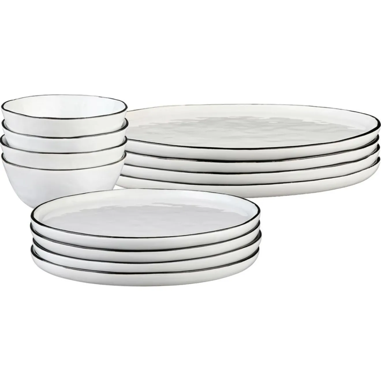 Un liseré noir délicat encadre chaque pièce, ajoutant un contraste moderne à la céramique d’un blanc éclatant