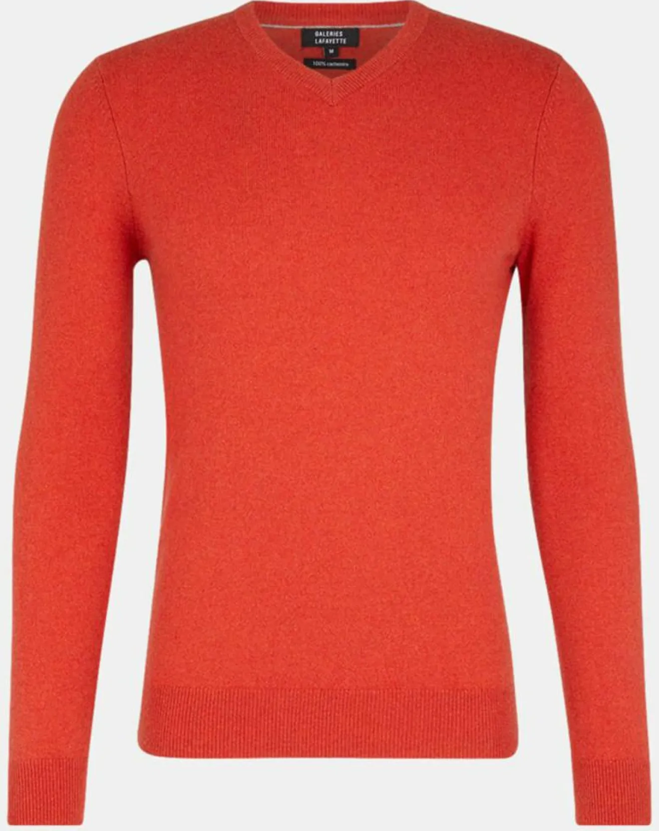 Ce pull droit Galeries Lafayette en cachemire est muni d’un col V, de manches longues et de finitions côtelées.