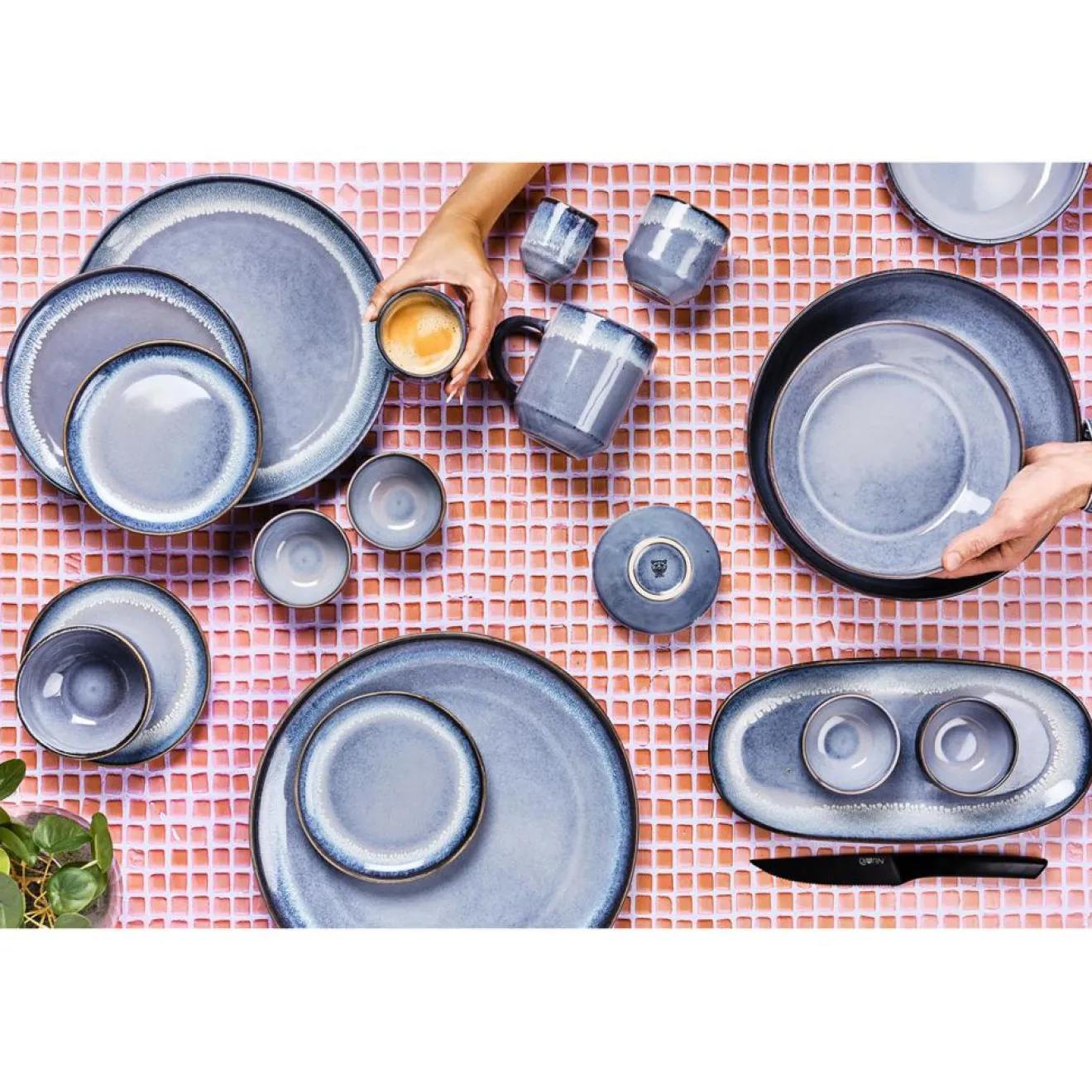 Après une première cuisson de l’argile à basse température, des émaux réactifs de couleurs différentes s’appliquent sur le grès et lui donnent un relief unique et éclatant. L’apparition de nuances de teintes que l’on retrouve d’une pièce à l’autre est le résultat d’un savant mélange artisanal des techniques de cuisson et du mode d’application de l’émail.