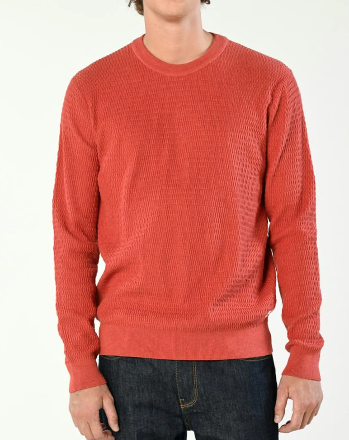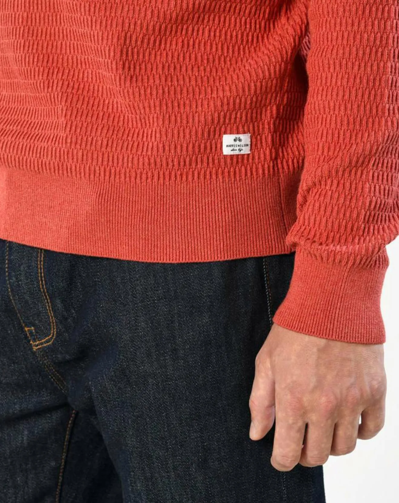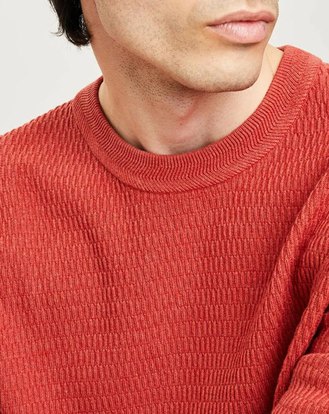 Cette pièce se distingue par sa maille texturée et sa couleur chaude brique chinée.