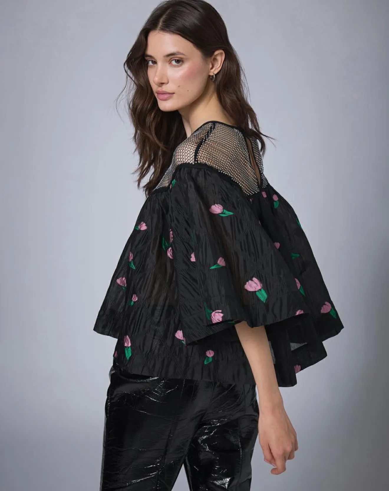 Résille à strass sur le haut, tissu géométrique et fleurs tissées sur le bas