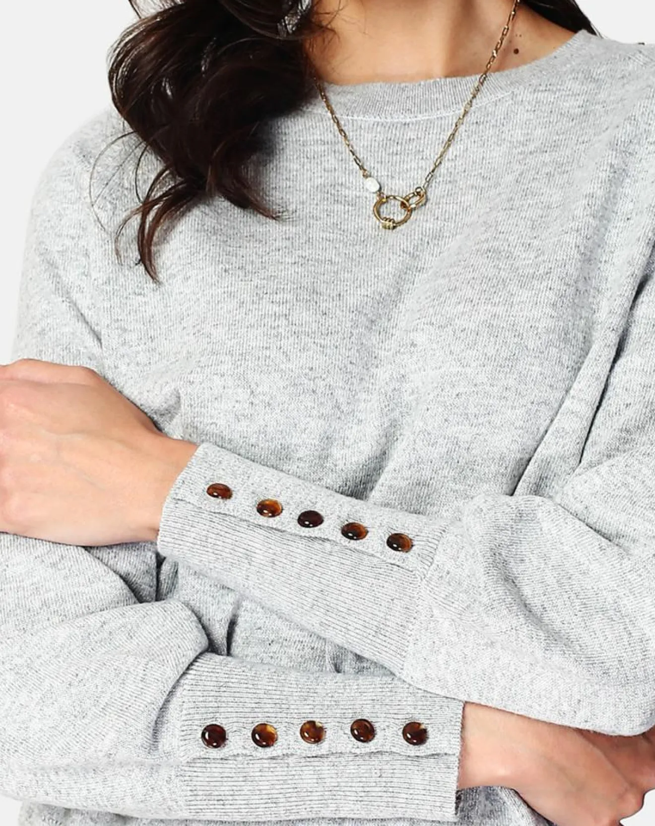 Pull large encolure ronde à manches longues légèrement ballon avec patte de boutonnage en bas de manche