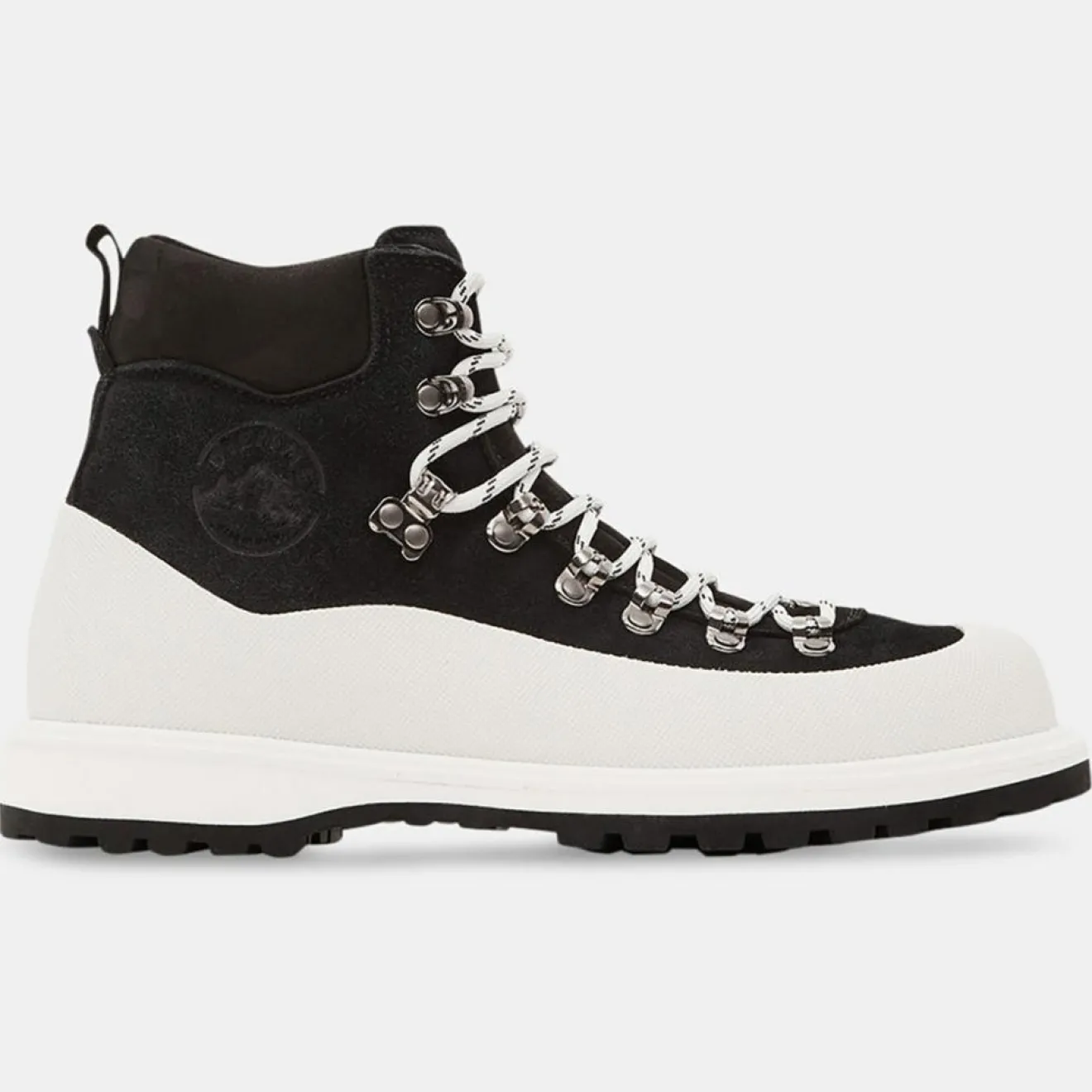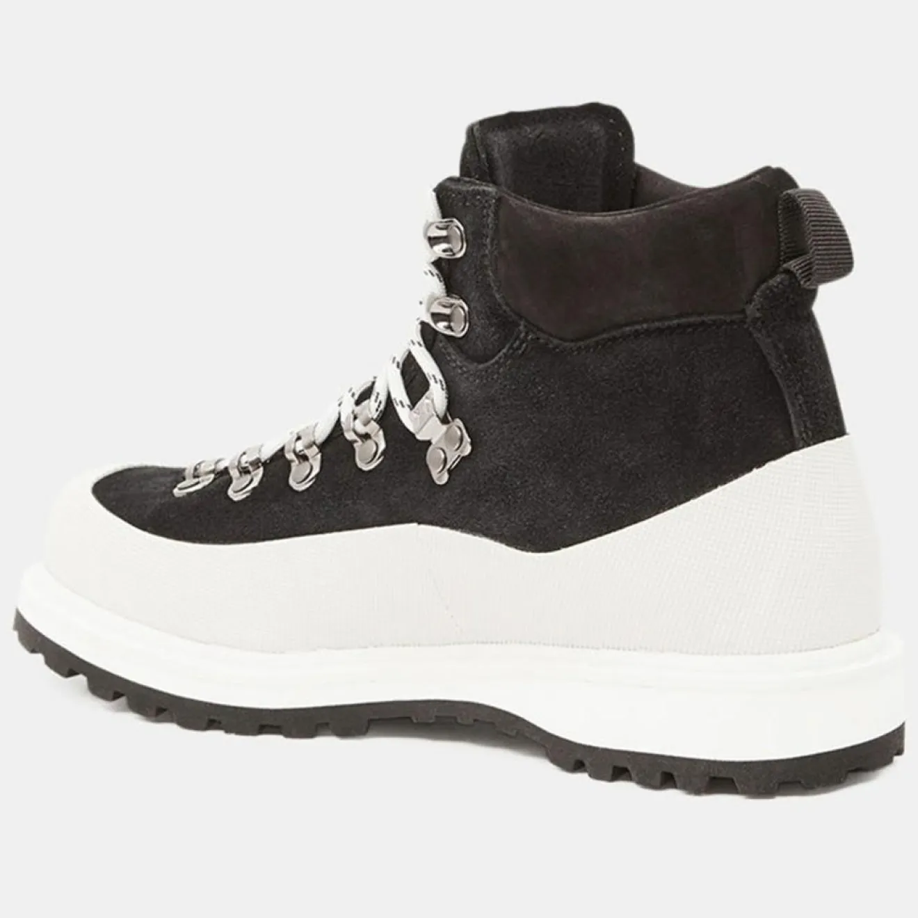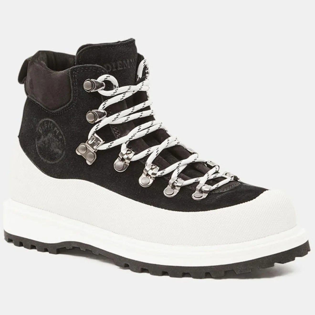 Ces boots de marche Diemme présentent une empeigne en daim avec large bordure contrastante texturée, un bout arrondi, un laçage 7 œillets métalliques, une languette rembourrée comme la cheville, une signature embossée, un intérieur cuir avec semelle Eurosole et une semelle extérieure crantée en caoutchouc.