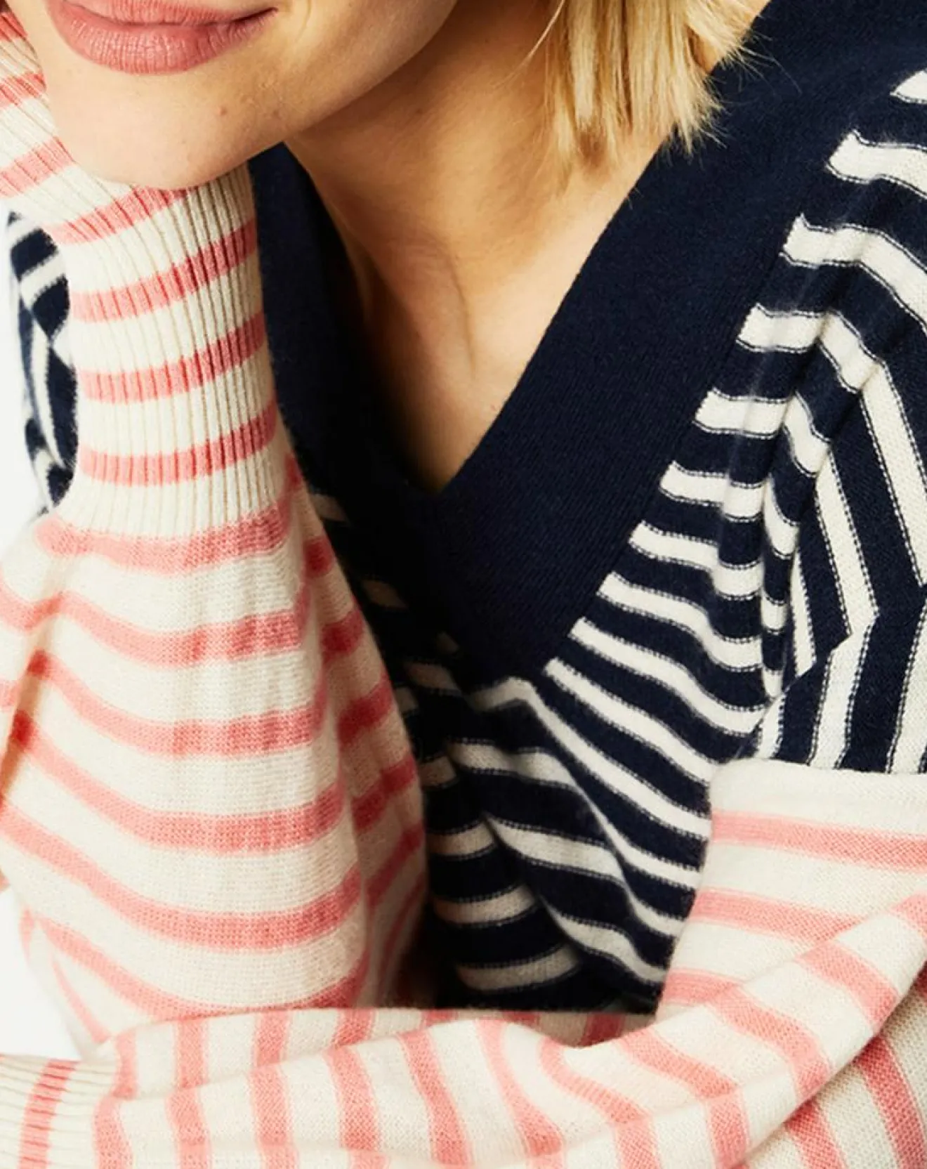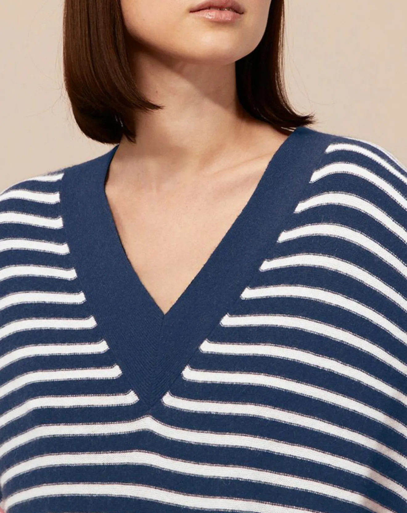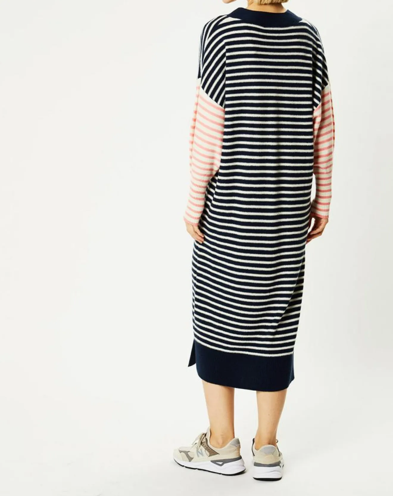 Cette robe pull mi longue Galeries Lafayette en cachemire présente un imprimé à rayures sur 2 coloris, un col V profond et des finitions côtelées.