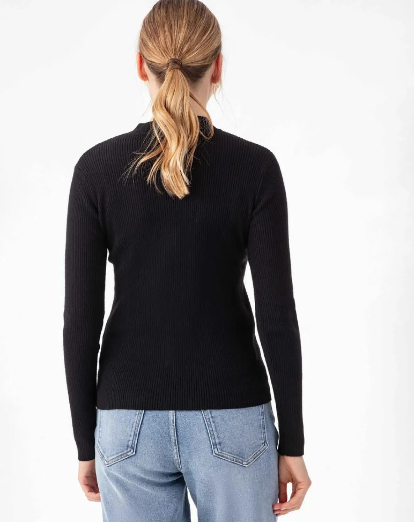 Cette saison, la maille INDIES se réinvente dans un pull chaussette noir près du corps, le pull TALITHA