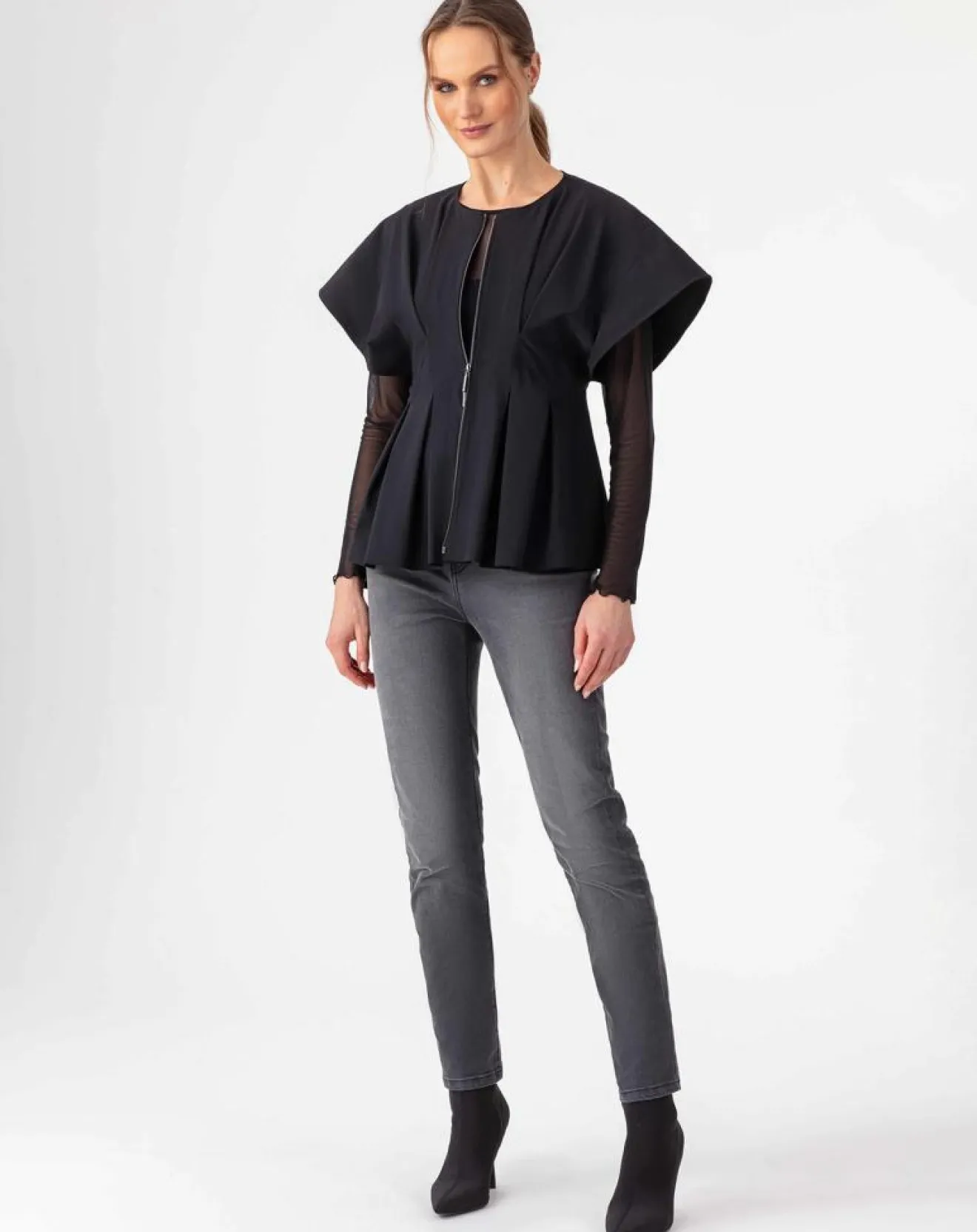 En jersey technique noir épais et zippée sur le devant, elle allie confort et structure pour une silhouette féminine et originale
