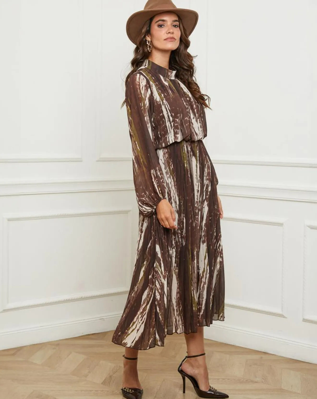 Robe imprimée col rond, manches longues, plissée après la taille