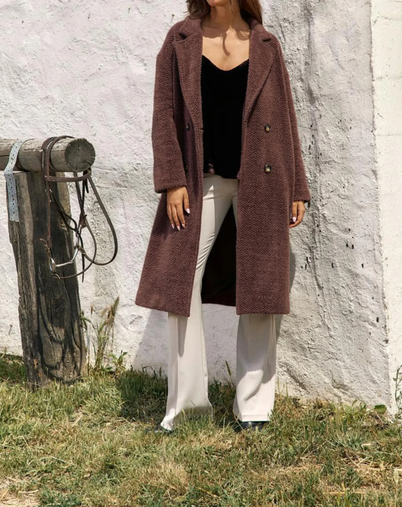 Manteau long fluide en maille duveteuse, large col, double boutonnage, manches avec larges poignets
