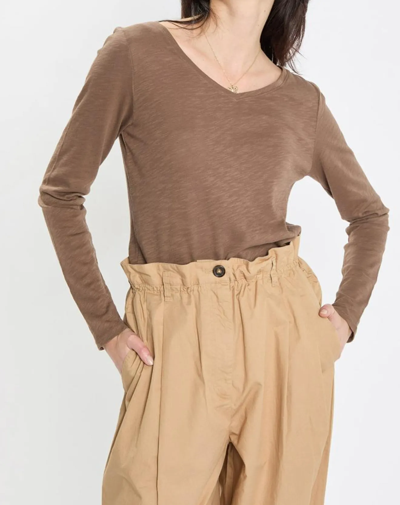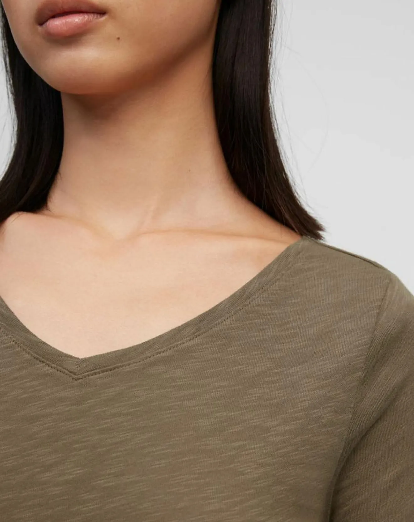 Large encolure en V, manches longues étroites et base droite.