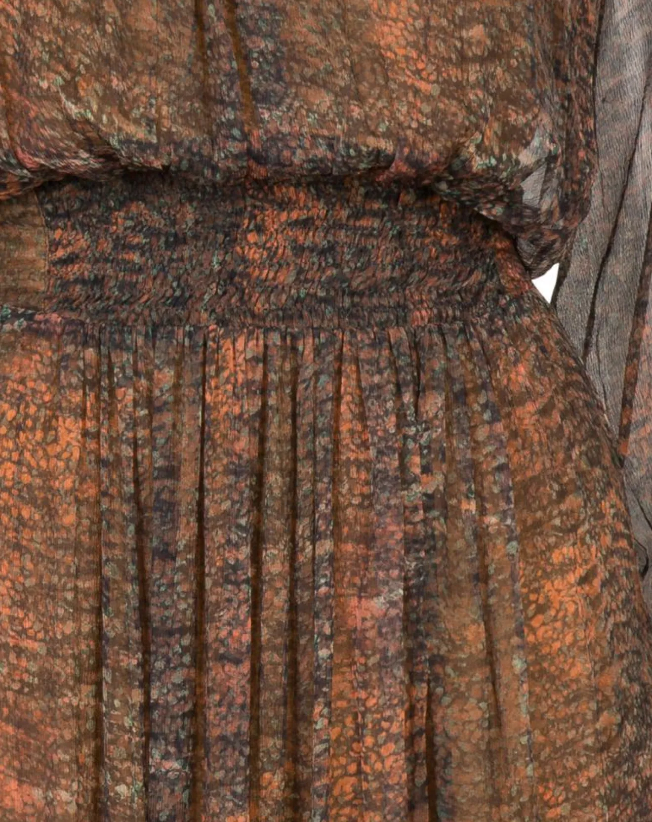 Notre robe Giuletta en mousseline imprimée adopte une coupe ample, soulignée par une taille smockée