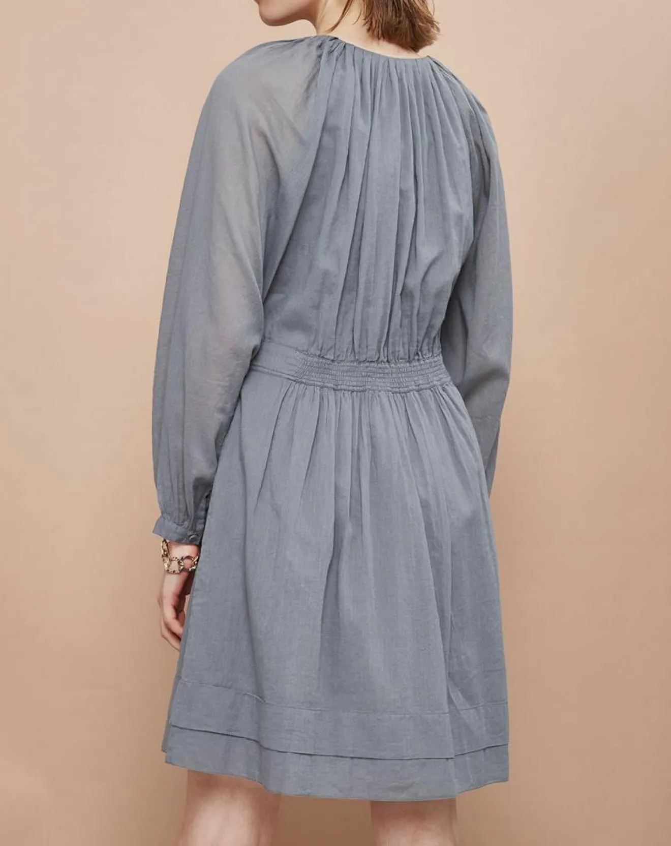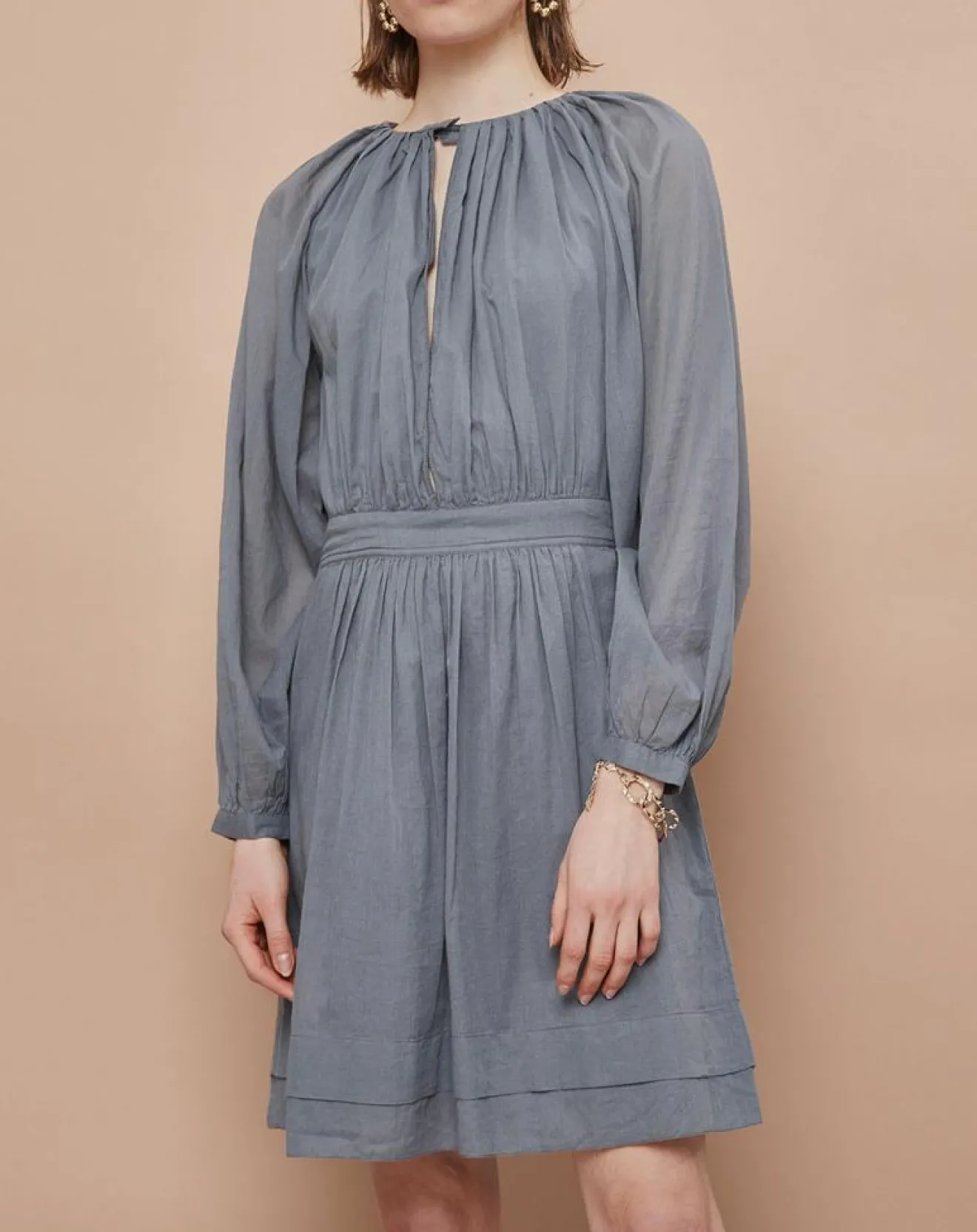 Avec ses manches bouffantes volumineuses resserrées aux poignets et sa taille marquée la robe courte OLERIA a des accents vintages