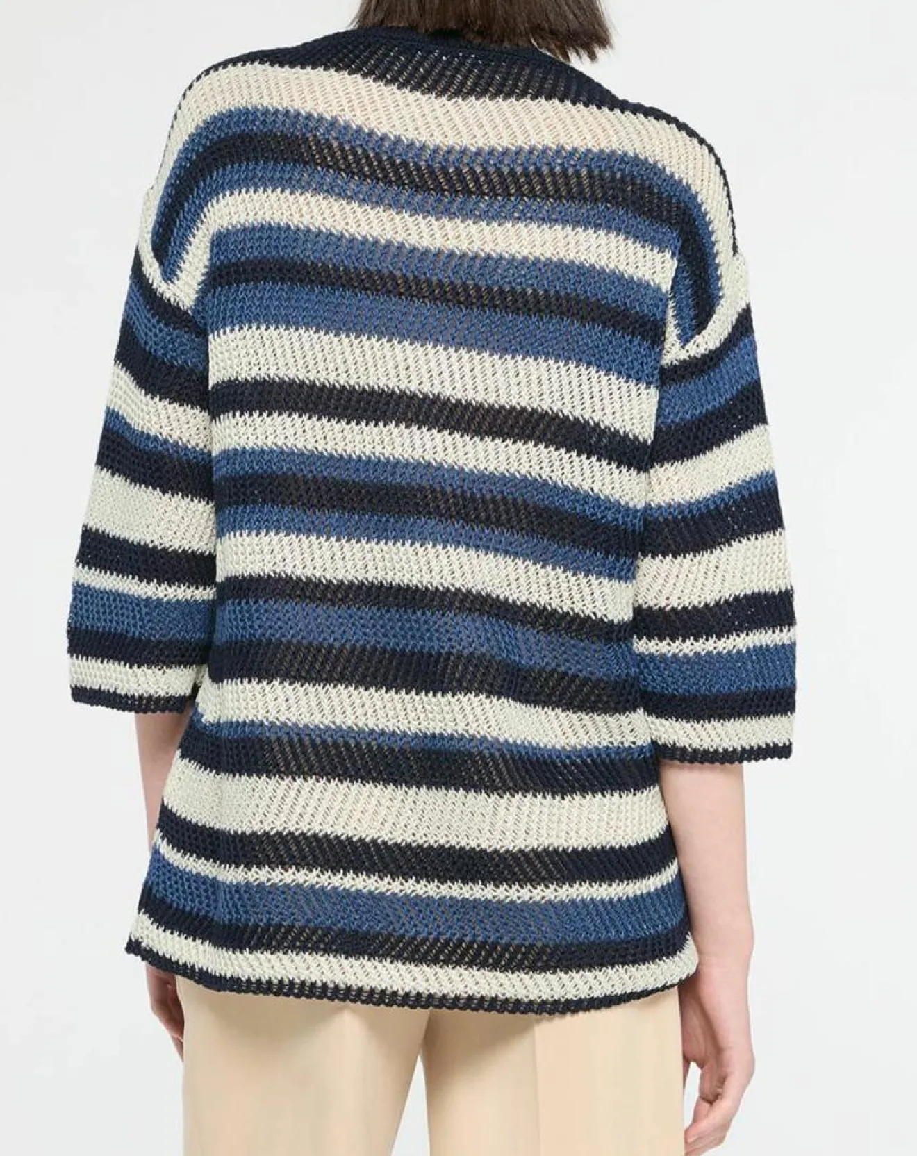 Ce pull droit ample Weekend Max Mara présente une maille en lin ajourée et rayée ainsi qu’un col rond évasé.