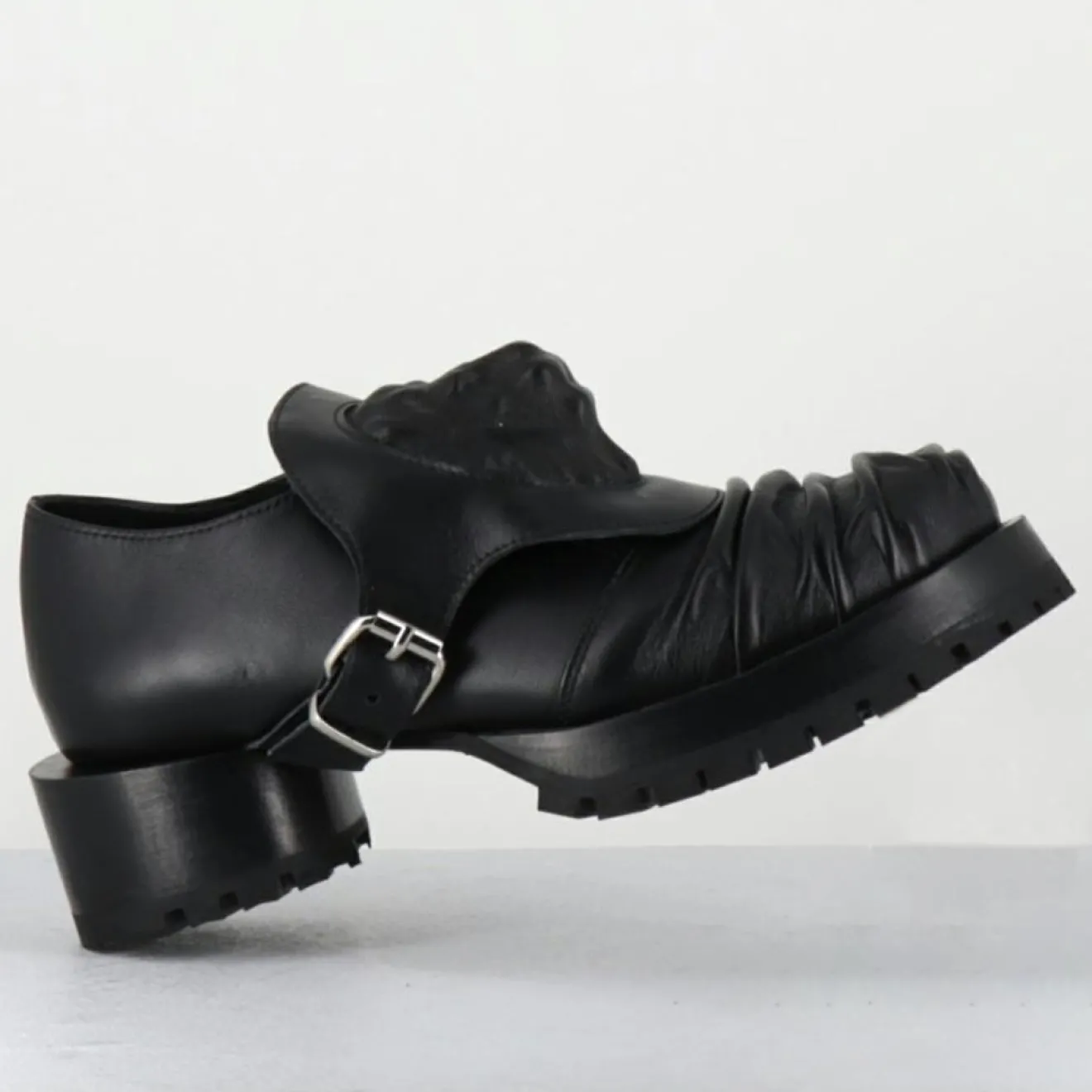 Chaussures derbies en cuir noir ornées d’un écusson à tête de lion esprit surréaliste qui se fixe à l’aide d’une petite boucle sur le côté