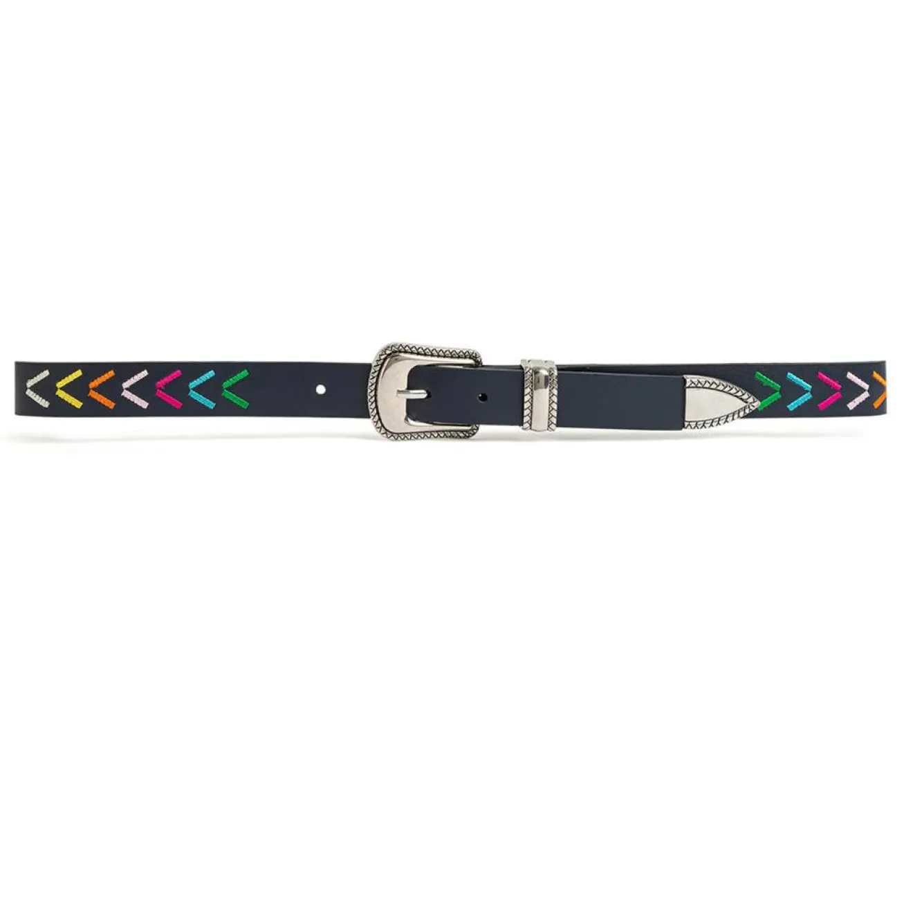 Ceinture en cuir bleu marine, brodée de fils multicolores arc-en ciel