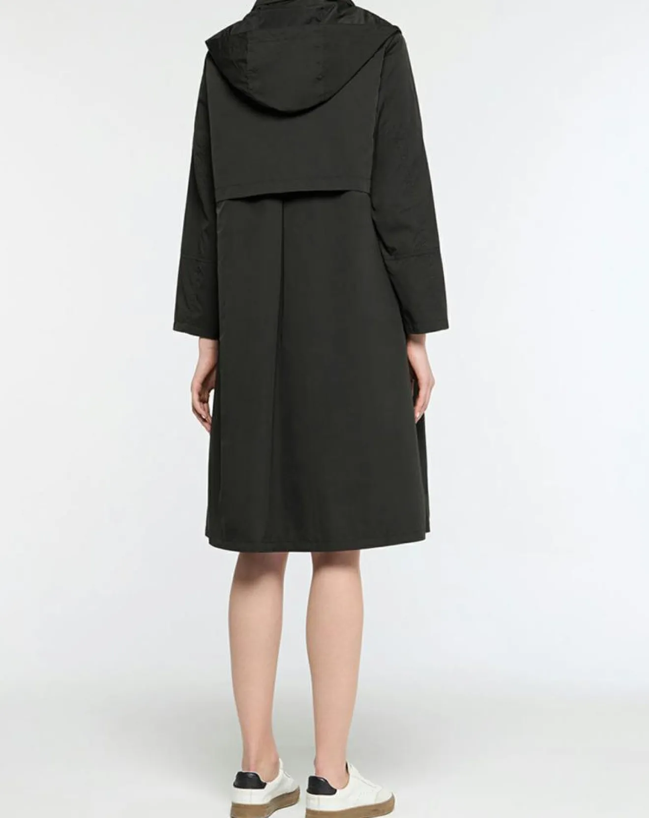 Cet imperméable longueur genoux Yerse est muni d’une capuche, d’une fermeture zippée dissimulée sous patte à boutons pression et de poches.