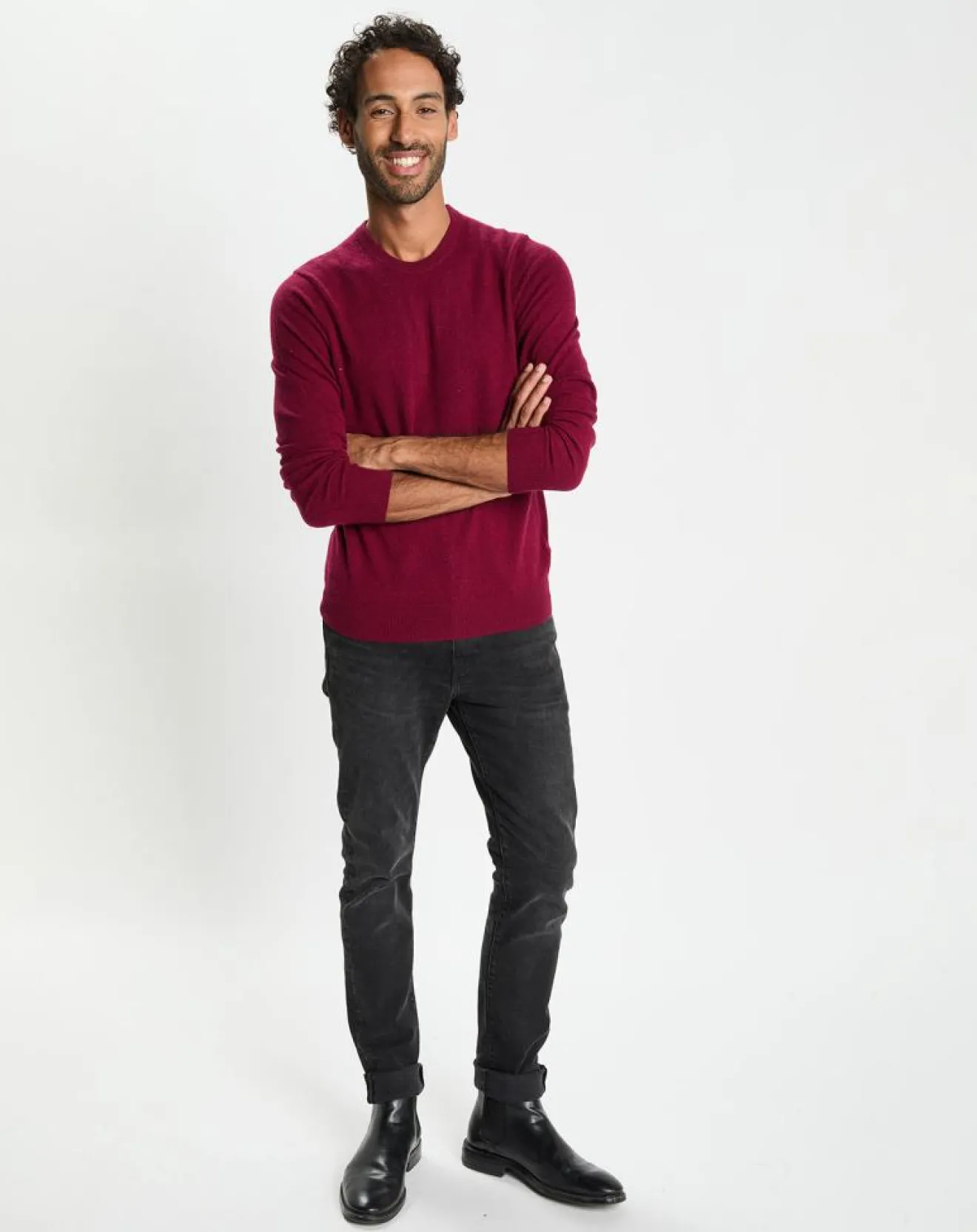 Pull droit en cachemire, muni d’un col rond, de manches longues, puis de finitions côtelées au col, aux poignets et à la base.