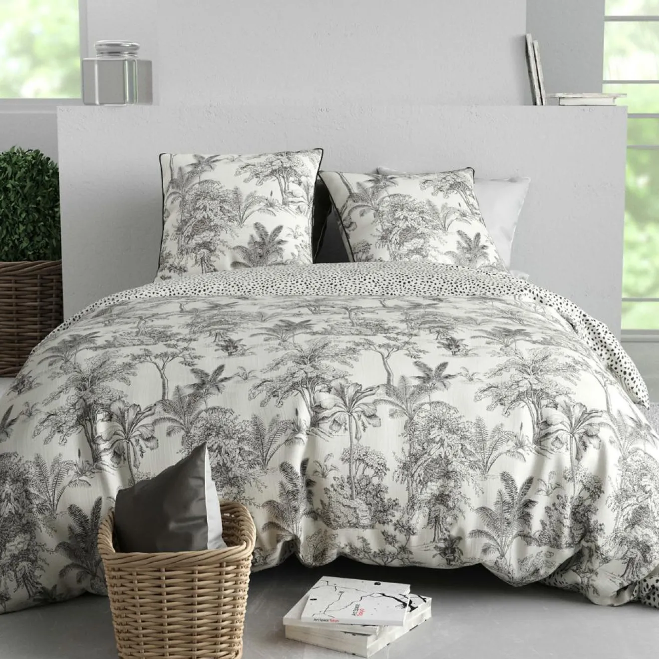 Caractéristiques de la housse de couette et de la taie d’oreiller : Matière : 100% coton (57 fils/cm²) Finition : housse de couette boutons dissimulés et taie portefeuille