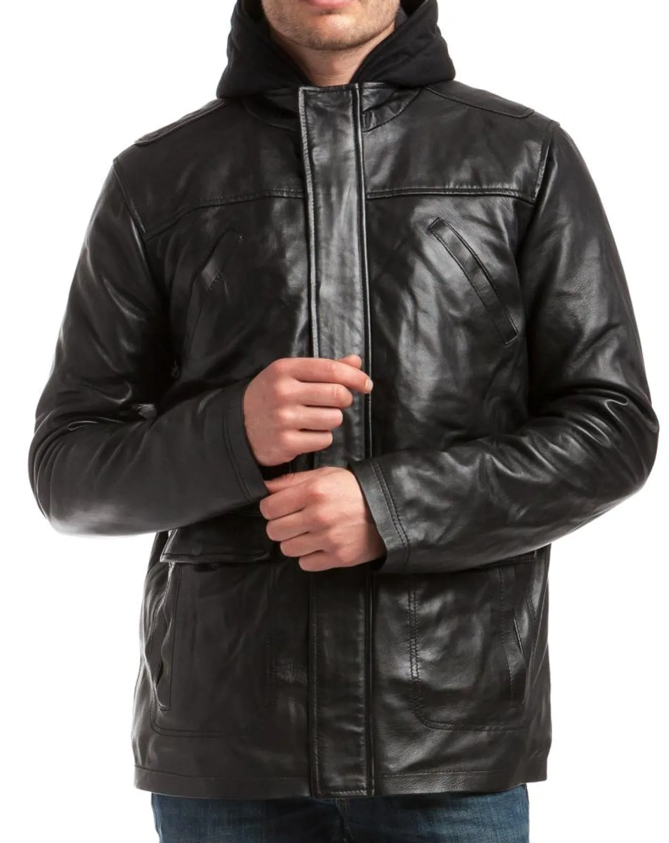 Veste en cuir mi-longue de type parka avec 2 poches poitrine et 2 poches latérales