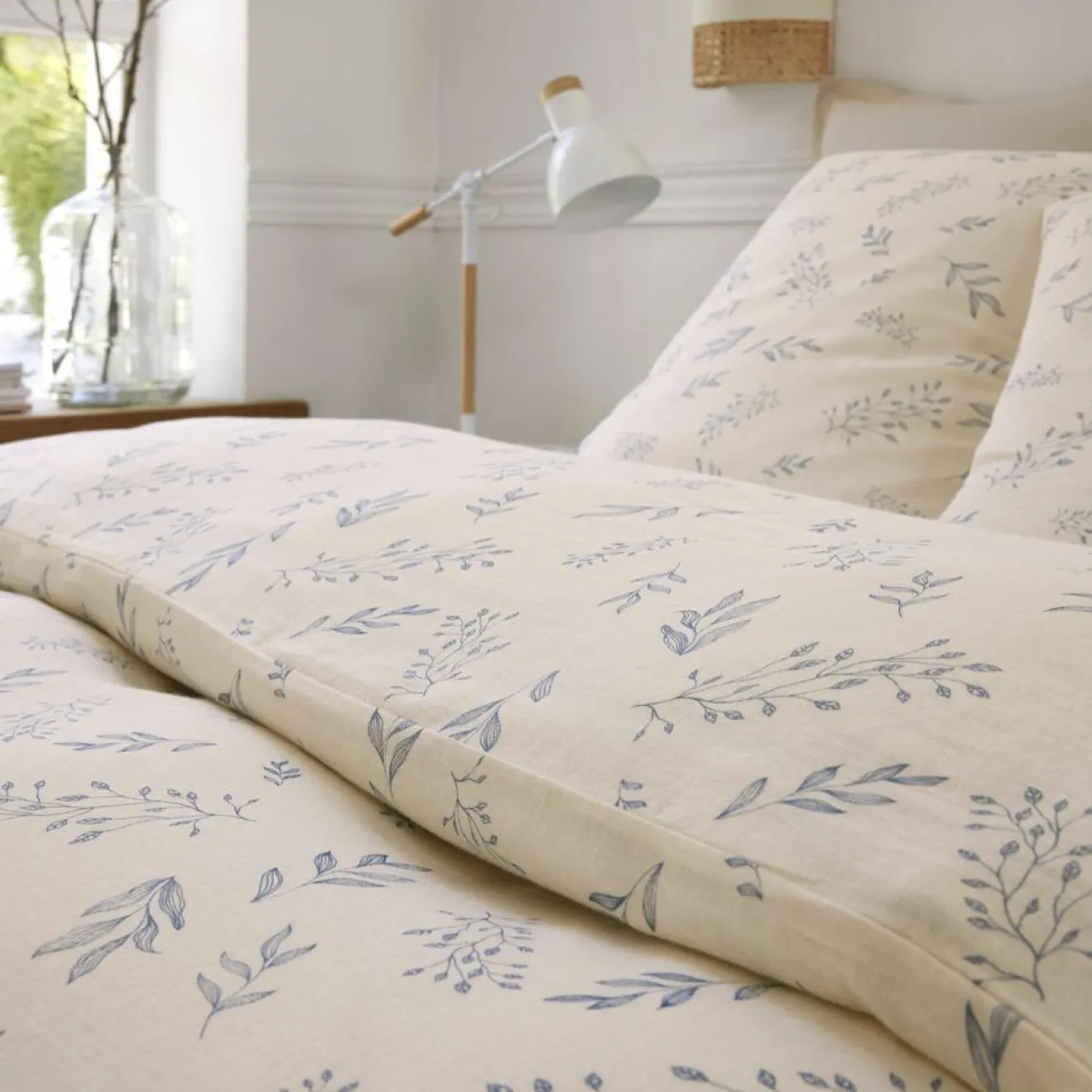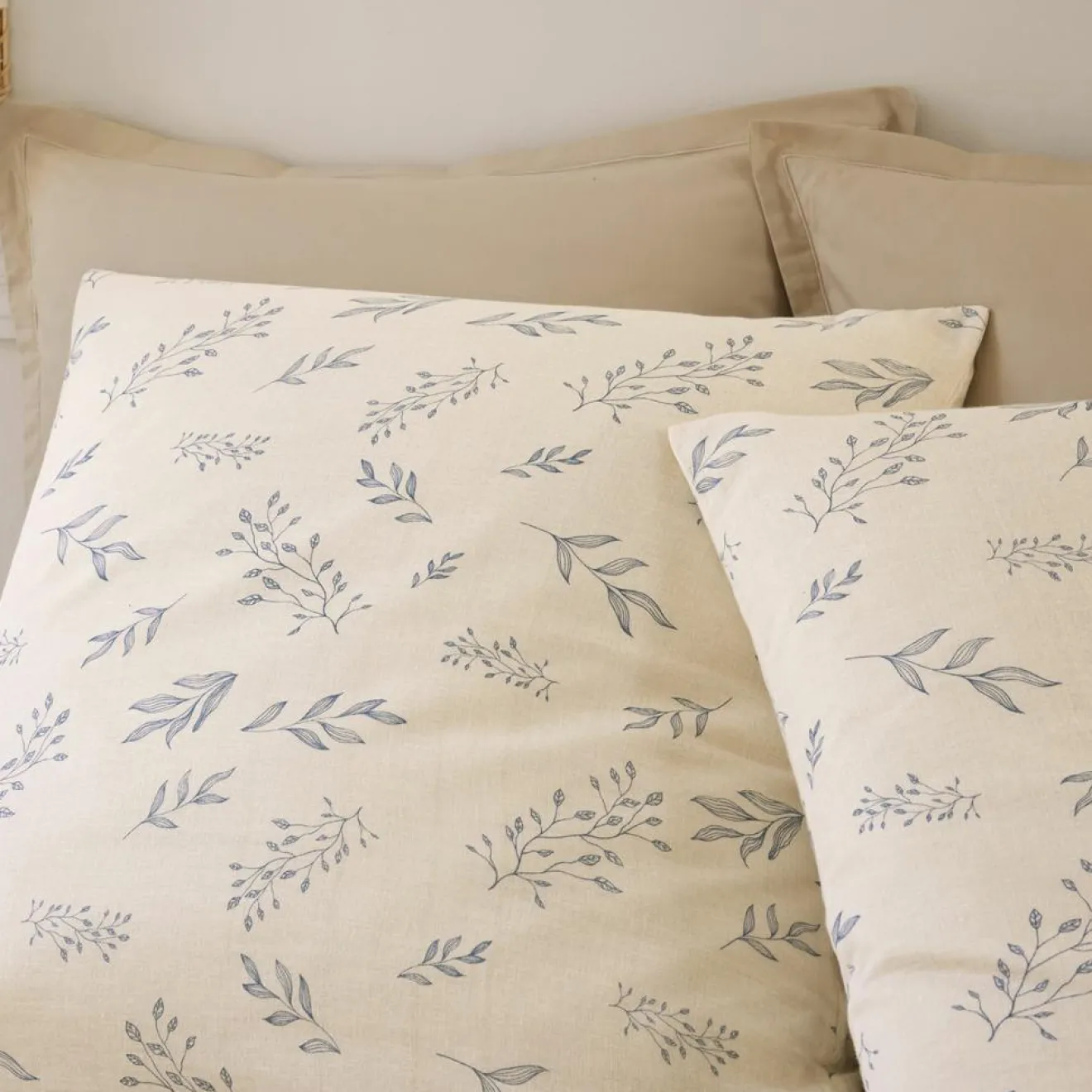 Le fond beige chaleureux est délicatement orné dun motif feuillage au trait fin bleu, pour un style à la fois graphique, naturel et épuré