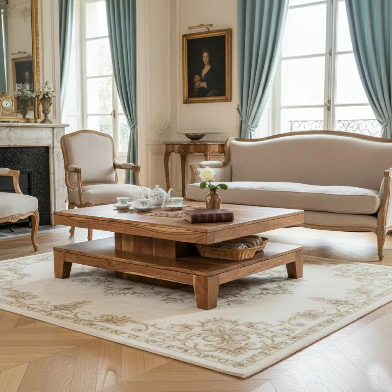Soin et savoir-faire se reflètent dans sa conception : le plateau épais est orné d’un détail sculpté distinctif, ajoutant un caractère subtil tout en mettant en lumière l’artisanat. En dessous, une étagère intégrée offre un espace pratique pour ranger livres, objets décoratifs ou essentiels du quotidien, alliant fonctionnalité et élégance. Le support central massif assure stabilité et équilibre, garantissant robustesse et longévité.