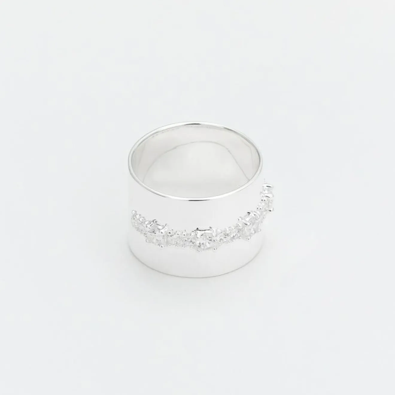 Bague en Argent en forme d’anneau plat et large décoré en son milieu d’une rangée d’oxydes blancs de différentes tailles