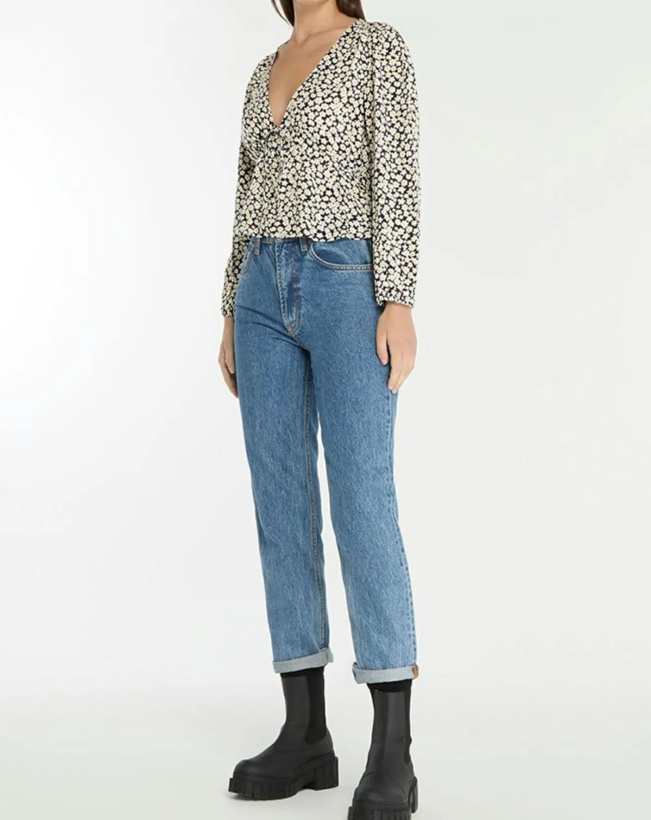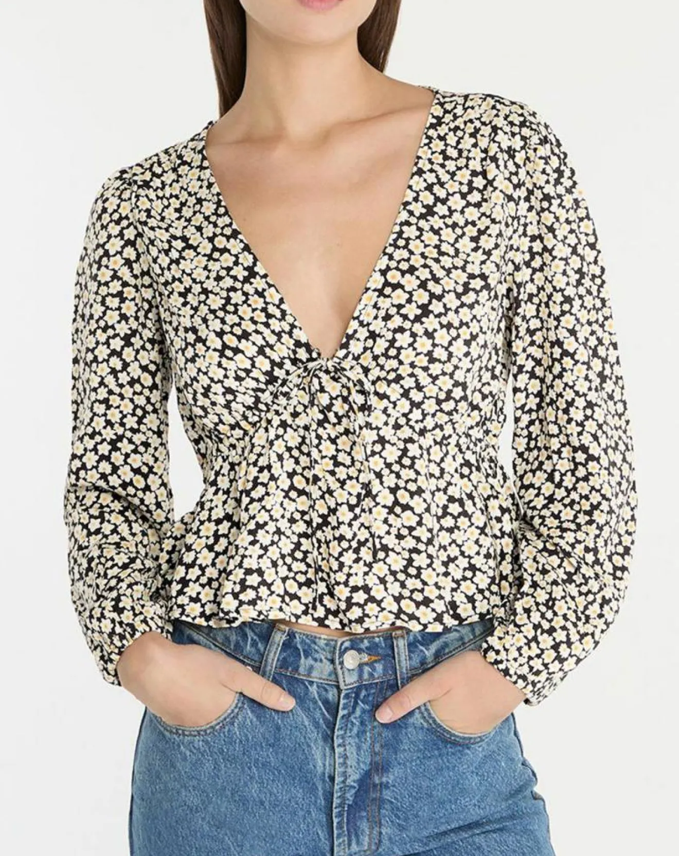 Ce top court Billabong présente un imprimé daisy all-over, une encolure en V, des manches longues ainsi qu’un lien à nouer sous poitrine