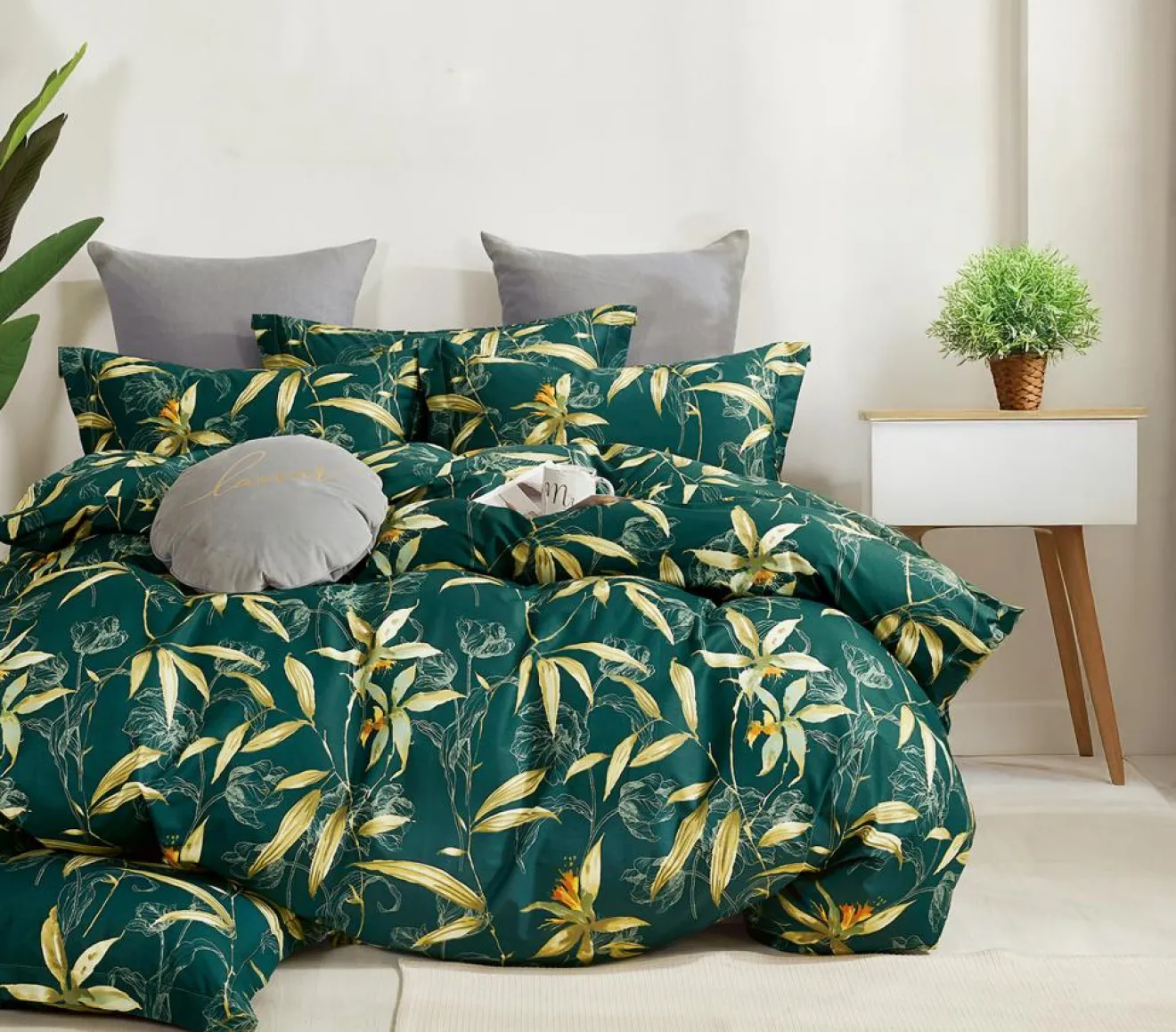 Plongez votre chambre dans une ambiance exotique et élégante avec la parure Bambusia, confectionnée en 100% percale de coton au tissage fin de 80 fils/cm². Son motif luxuriant de feuilles dorées et vert clair sur un fond vert profond crée une atmosphère chaleureuse, naturelle et raffinée.