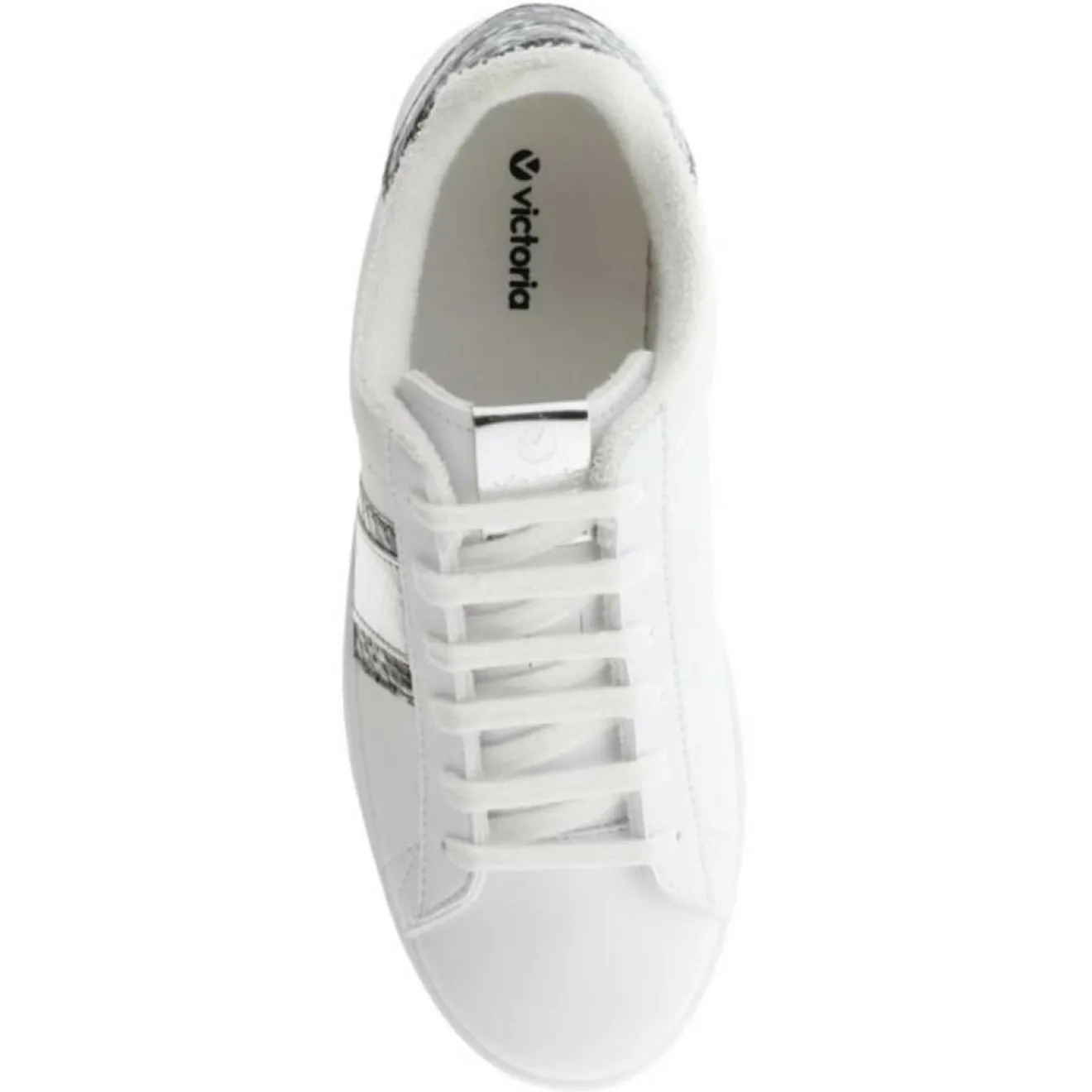 Ces baskets basses Victoria blanches présentent une fermeture lacets, des empiècements d’imprimé serpent ainsi qu’une bande argentée sur le côté.
