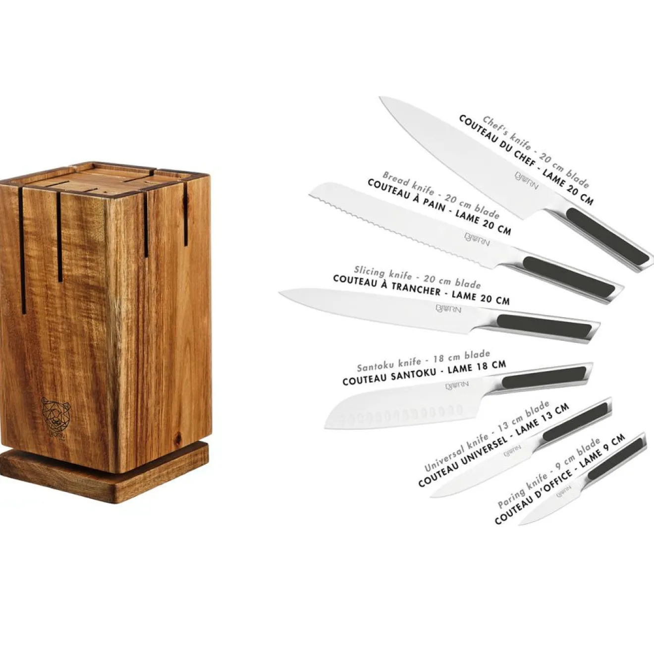 – Fabriqué en acier inoxydable finition satinée et poignée ABS (couteaux) – bois d’acacia (bloc)