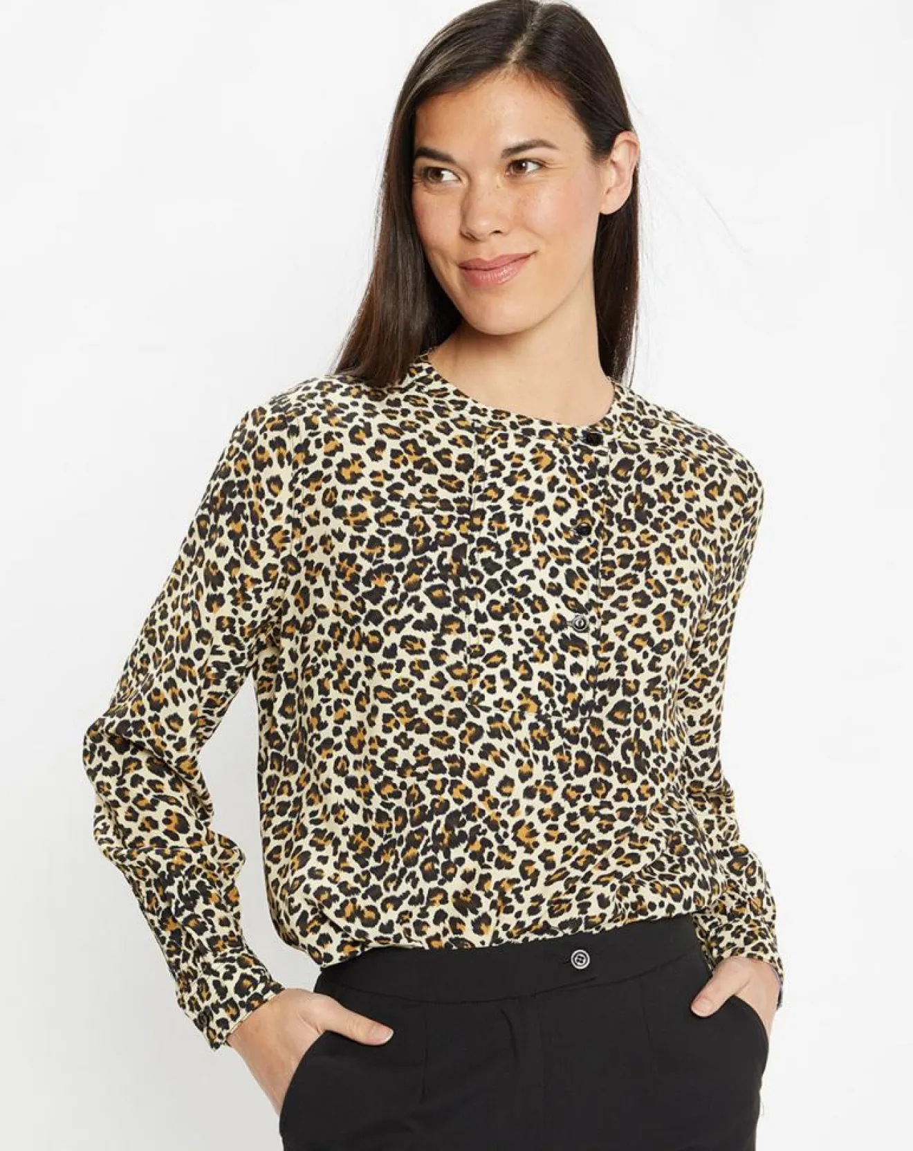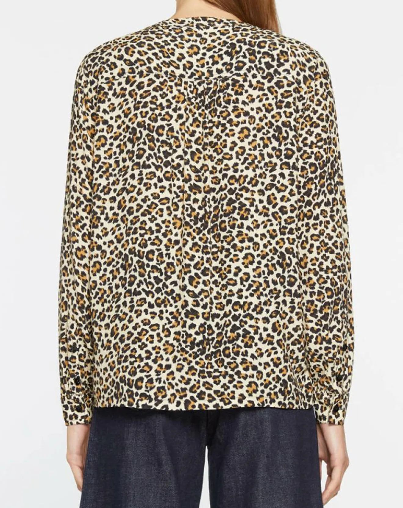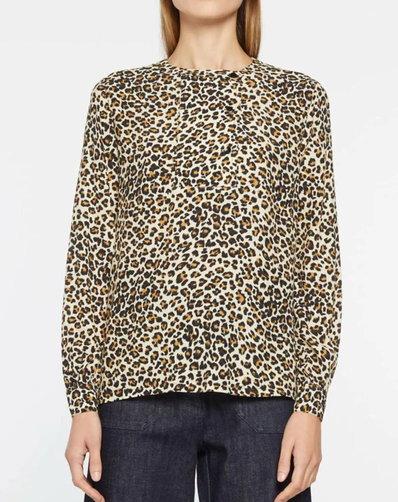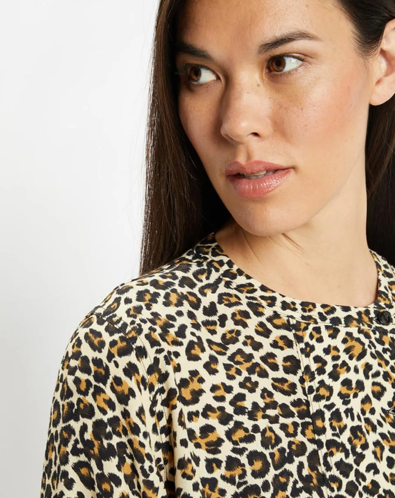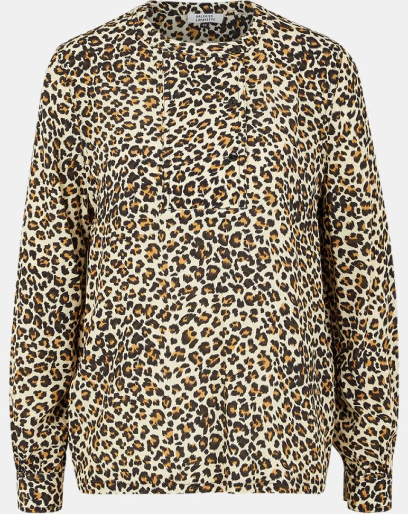Cette chemise droite Galeries Lafayette présente un imprimé léopard, un col officier et une petite fermeture boutonnée en plastron.