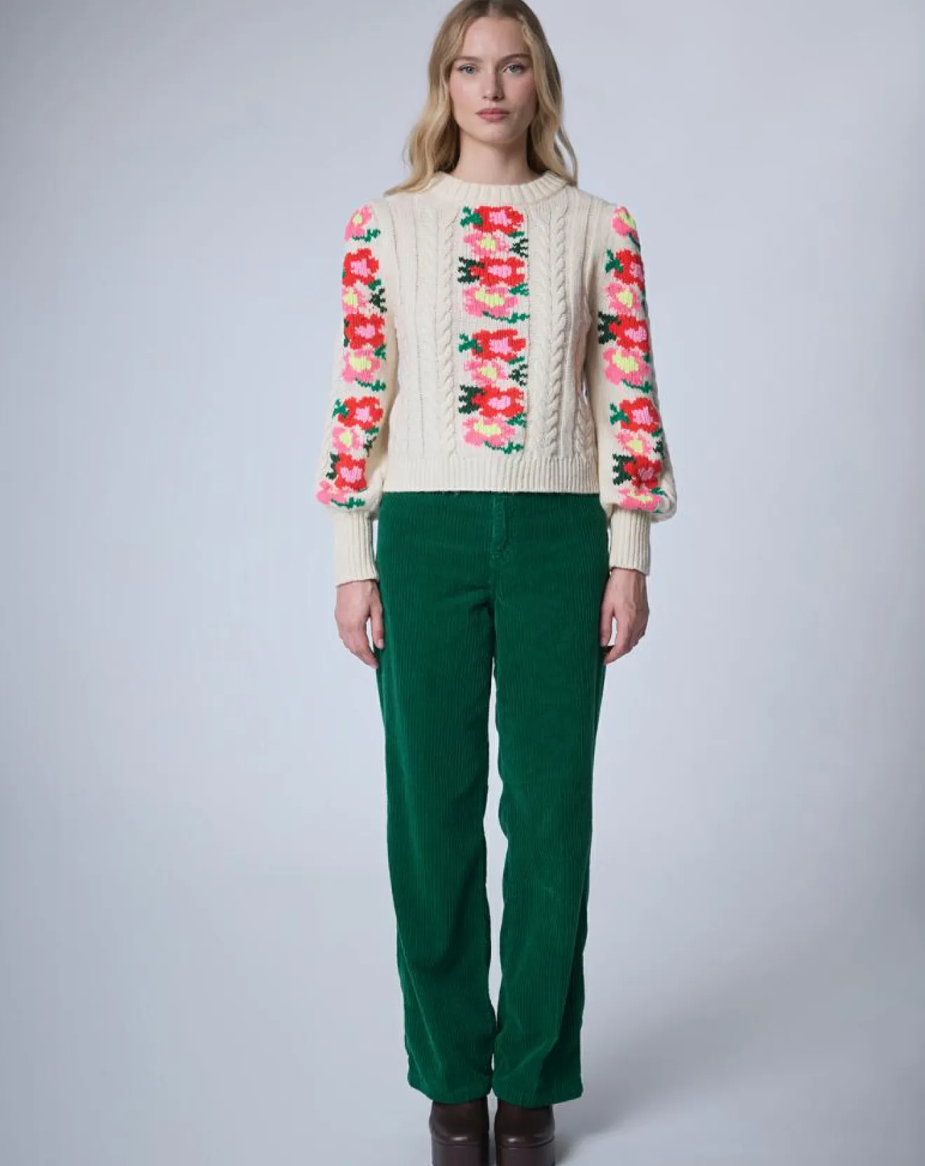 Bord côte côtelé à l’encolure, sur le bas des manches et du pull.