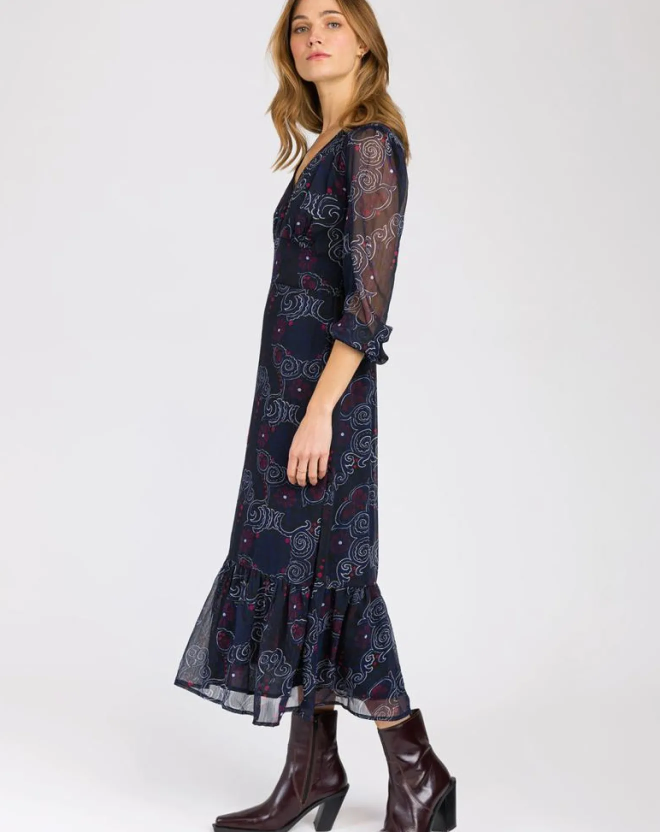 Séduisante, la robe midi OCLANDE souligne la féminité du corps avec son empiècement sous la poitrine et son tissu en voile qui lui donne une coupe aérienne