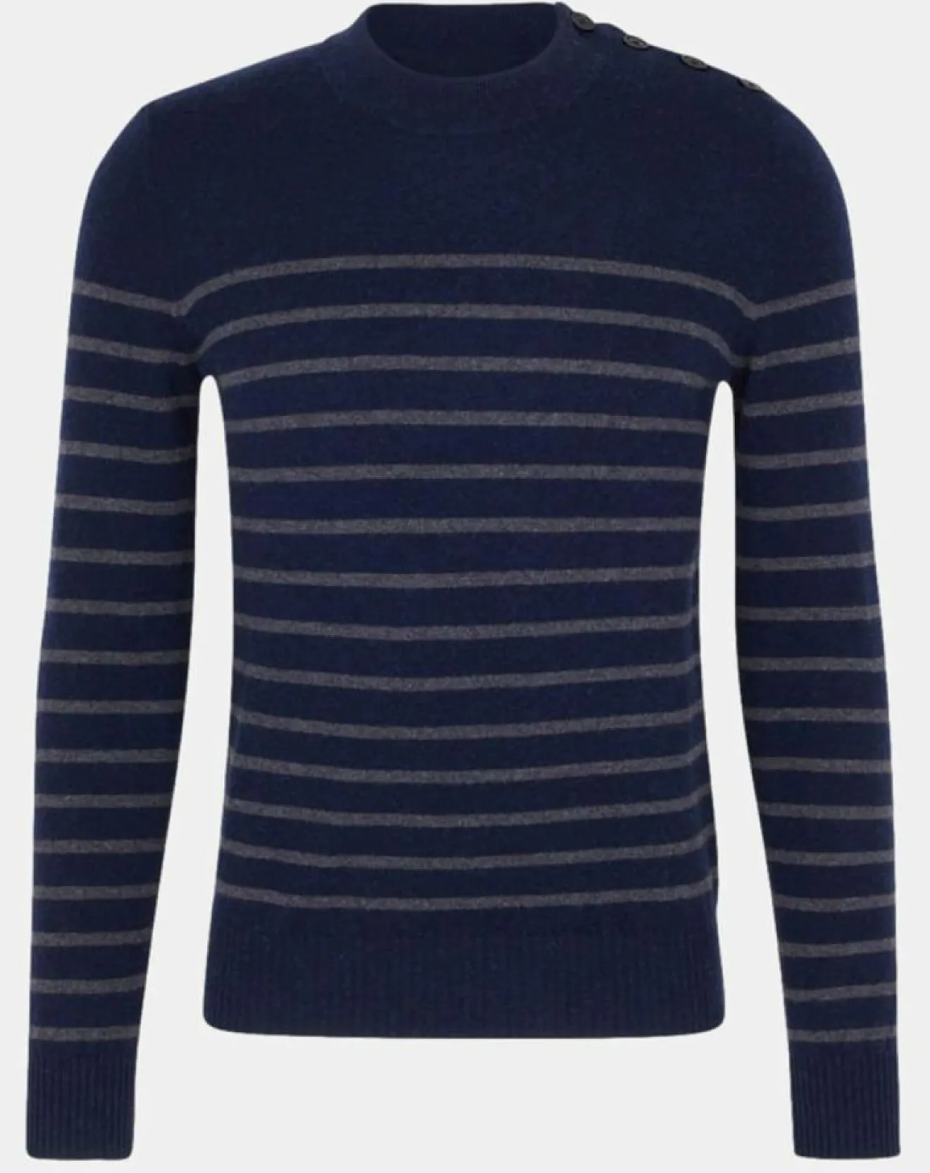 Ce pull ajusté Galeries Lafayette composé de laine et cachemire, présente un col rond, une fermeture boutonnée sur l’épaule gauche, des fines rayures, des manches longues et une maille côtelée.