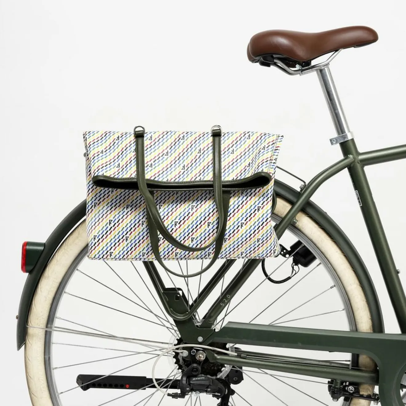 La plaque signature FARET en cuir permet à ce sac de s’accrocher de plusieurs manières sur le vélo, au niveau du panier avant ou du porte-bagage arrière