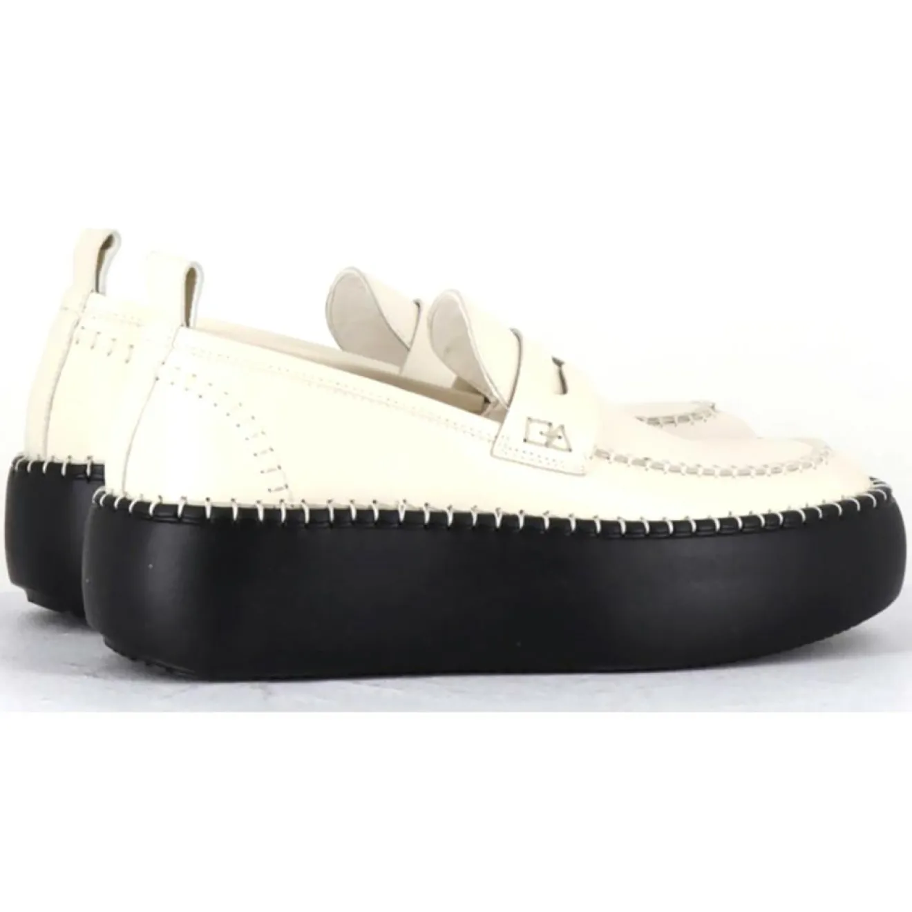 Mocassins en cuir blanc cassé avec surpiqures à l’avant et à l’arrière, montées sur une semelle épaisse légère en gomme noir avec surpiqures blanches contrastantes. D’un grand confort !