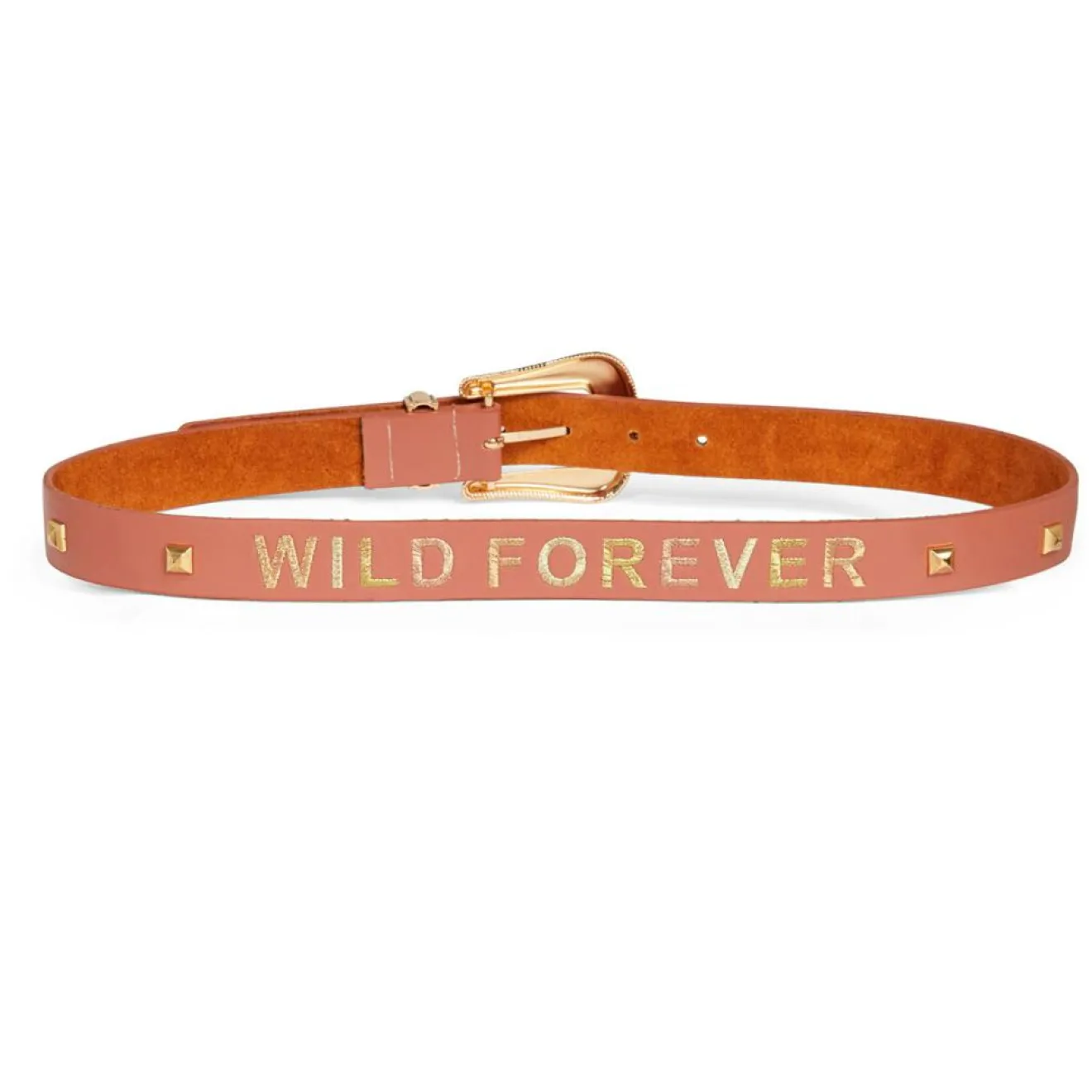 Ceinture en cuir rose, brodée de fils colorés dans les tons doré, cuivre et marron