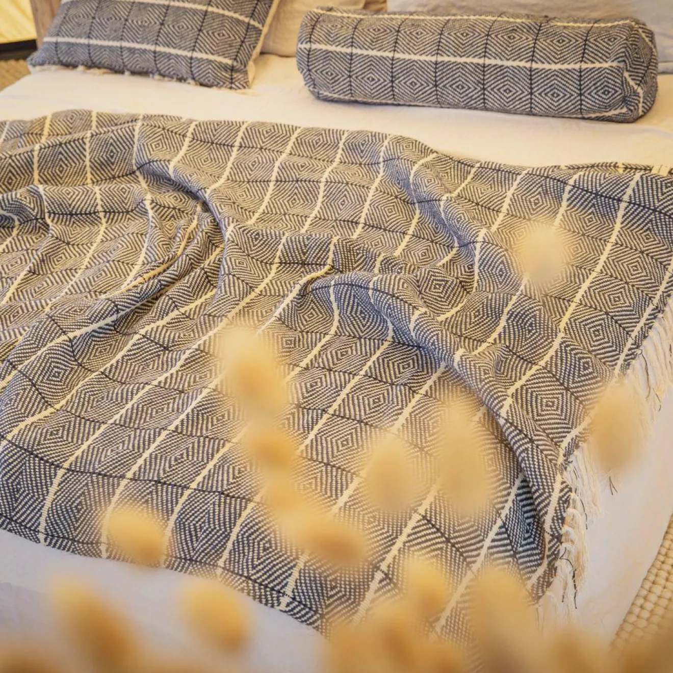 Le plaid Canyon, aux teintes bleu profond et son motif quadrillé contrasté plus clair, s’inspire des paysages méditerranéens pour apporter une touche de fraîcheur et d’élégance à votre intérieur. Confectionné en lin et coton, il allie douceur et légèreté, tandis que ses finitions frangées ajoutent une note bohème et raffinée.