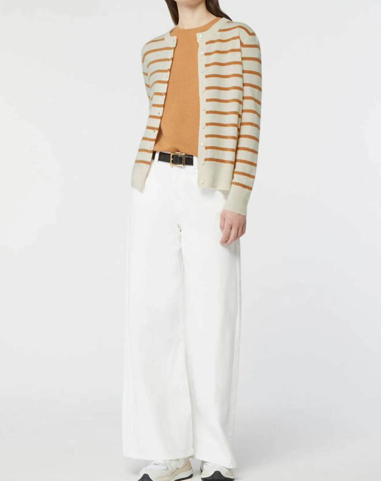 Ce cardigan droit Galeries Lafayette en laine responsable et cachemire, à rayures contrastantes est muni d’un col rond, de manches longues, d’une fermeture boutonnée et de finitions côtelées.