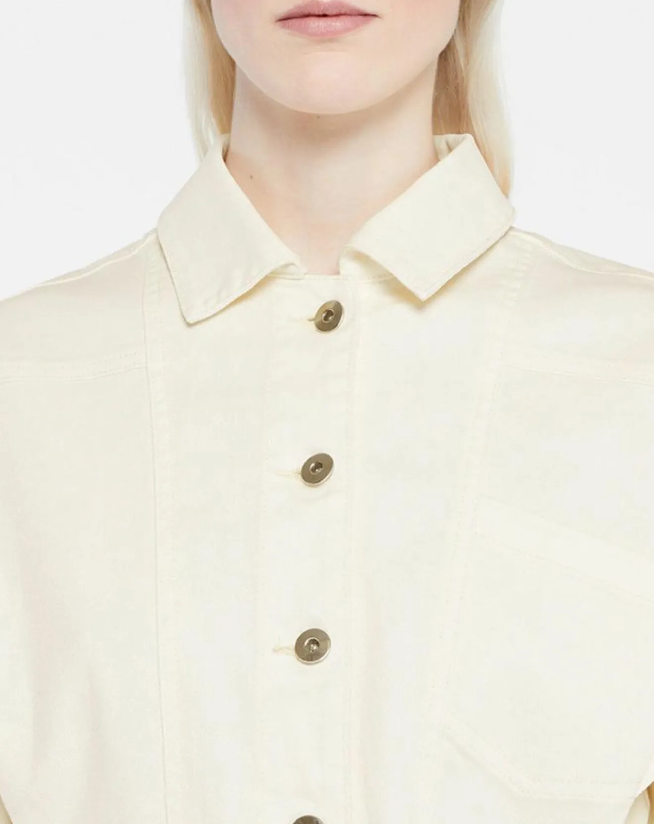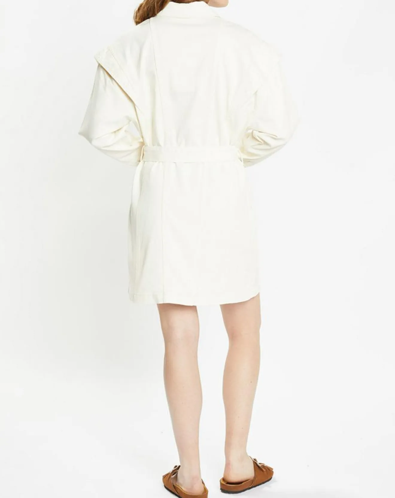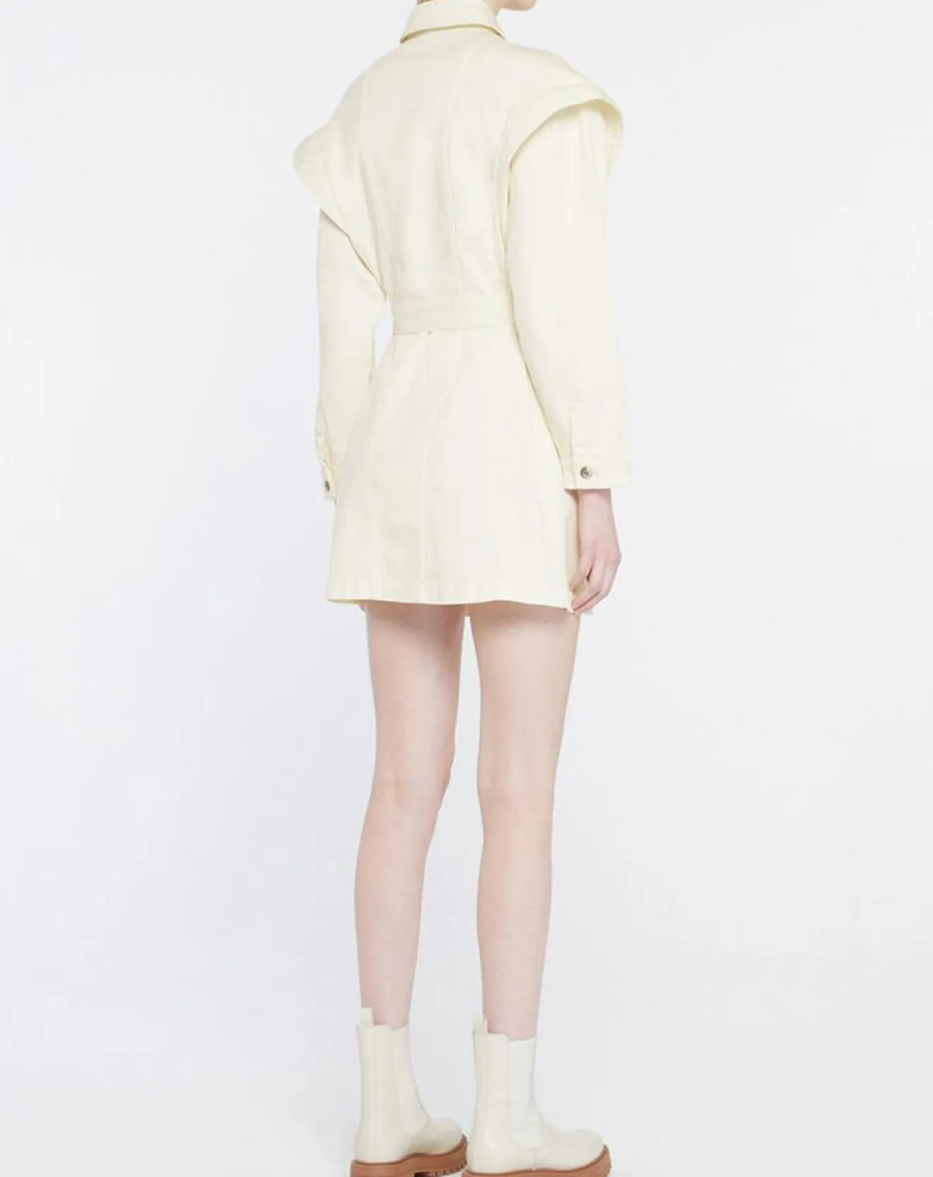 Cette robe courte Galeries Lafayette en coton jean est munie d’un col classique, d’une fermeture boutonnée métallique, de poches, de parements aux emmanchures et d’une ceinture à nouer.