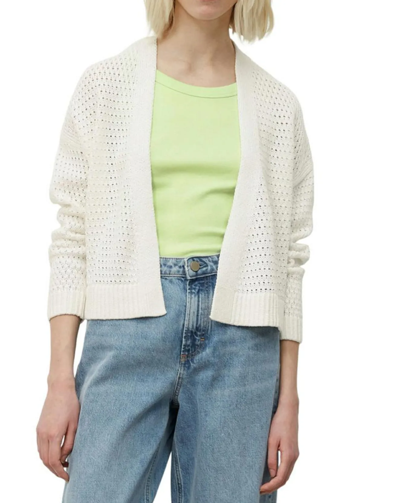 Modèle favori absolu pour la mi-saison : le petit cardigan décontracté à texture filet vaporeuse.