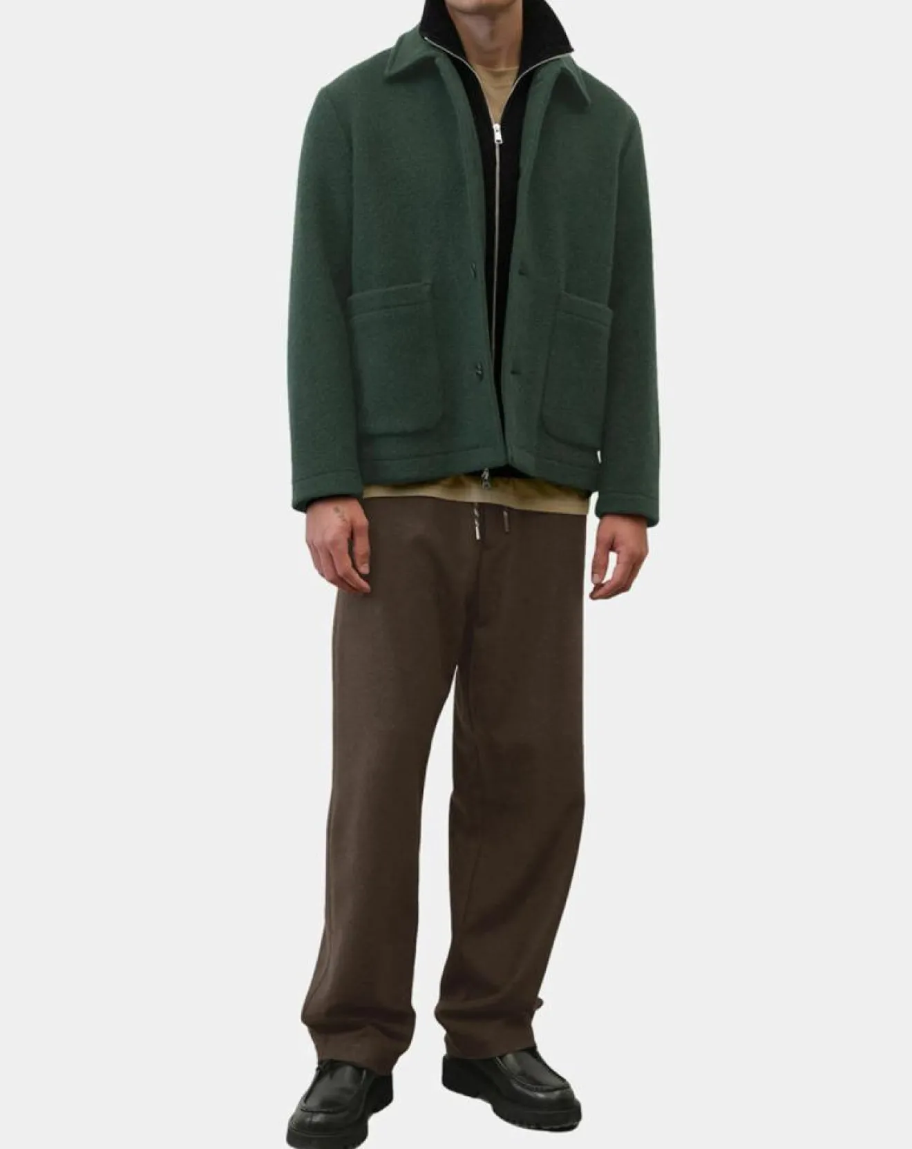 Il présente une coupe moderne et décontractée en O, un col à rabattre, une patte de boutonnage sur toute la longueur à boutons d’aspect corne, des poches plaquées sur les côtés et une base droite.