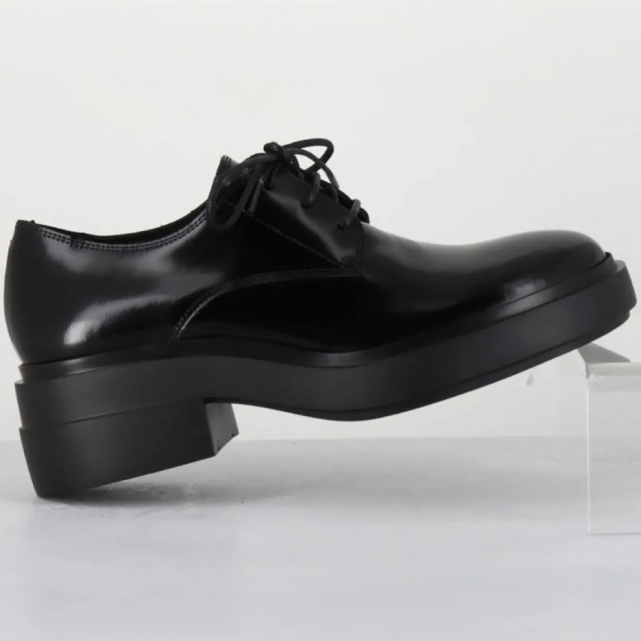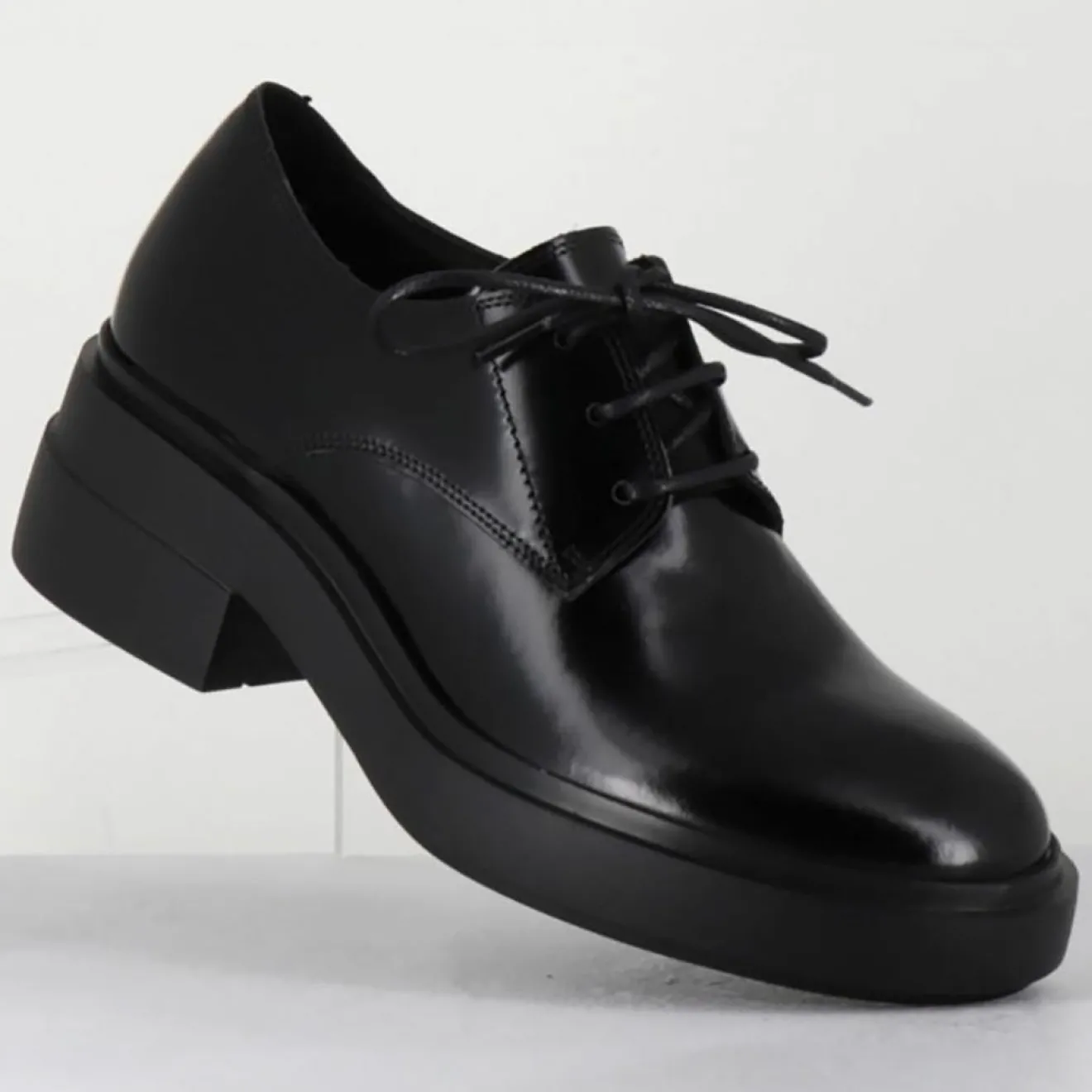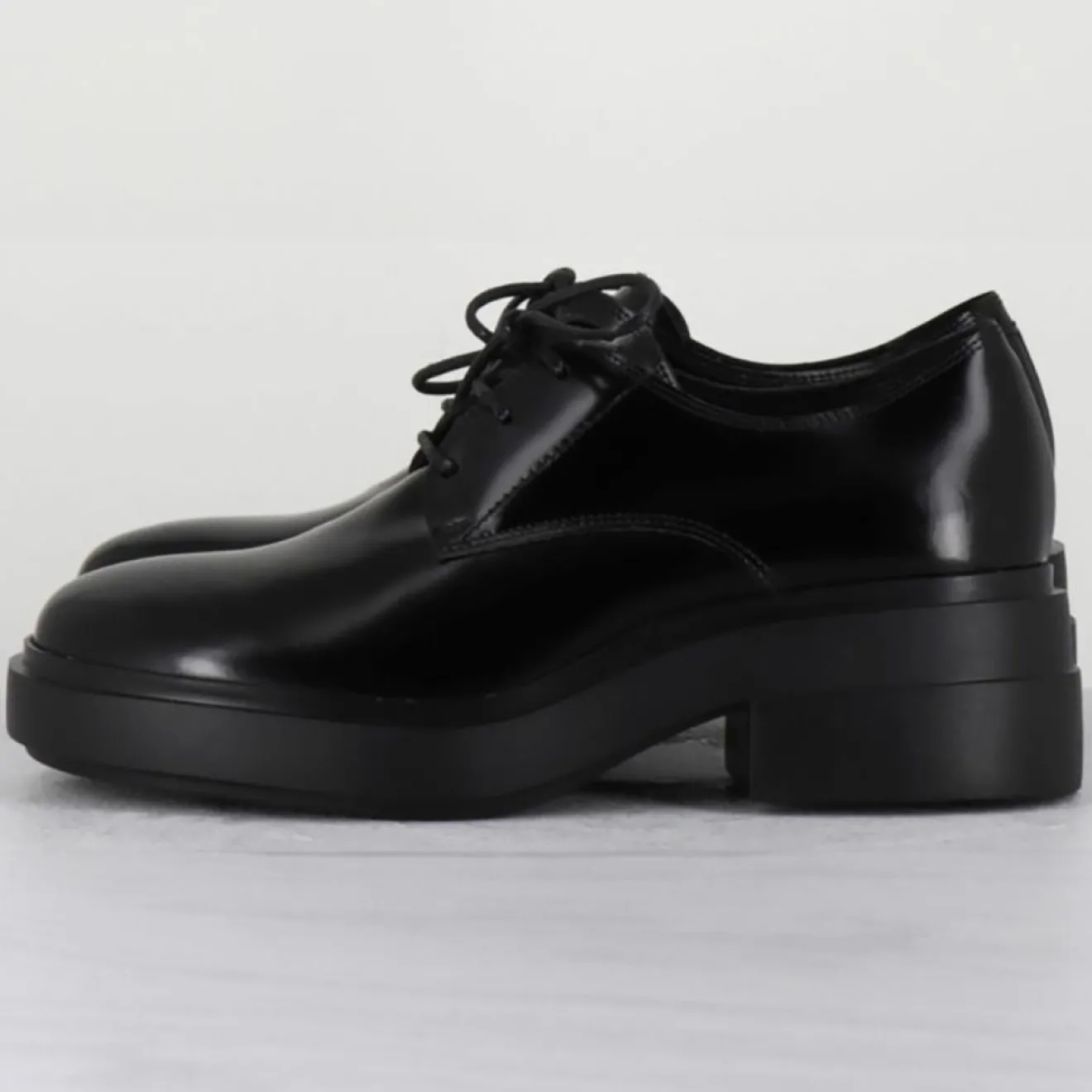 Derbies à lacets en cuir noir effet légèrement glacé, bout effilé, élastique intérieur pour plus d’aisance, montées sur une semelle ultra légère en microfibre à petit talon.