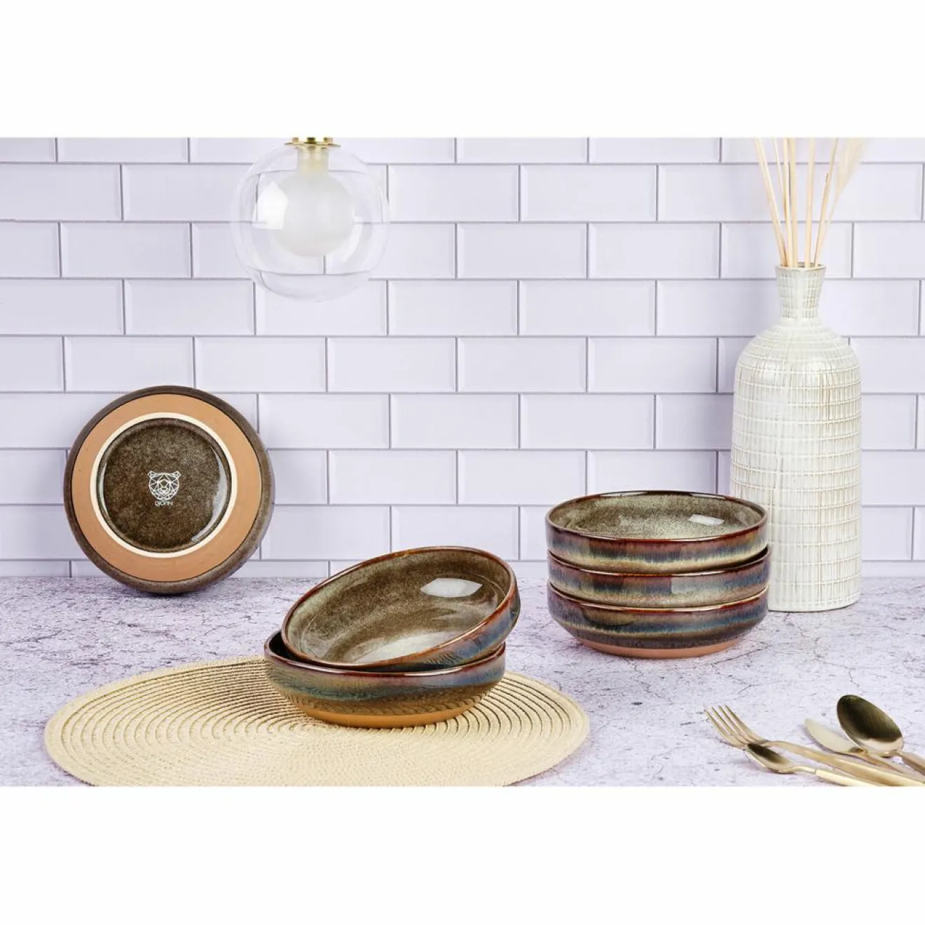 Après une première cuisson de l’argile à basse température, des émaux réactifs de couleurs différentes s’appliquent sur le grès et lui donnent un relief unique et éclatant. L’apparition de nuances de teintes que l’on retrouve d’une pièce à l’autre est le résultat d’un savant mélange artisanal des techniques de cuisson et du mode d’application de l’émail.