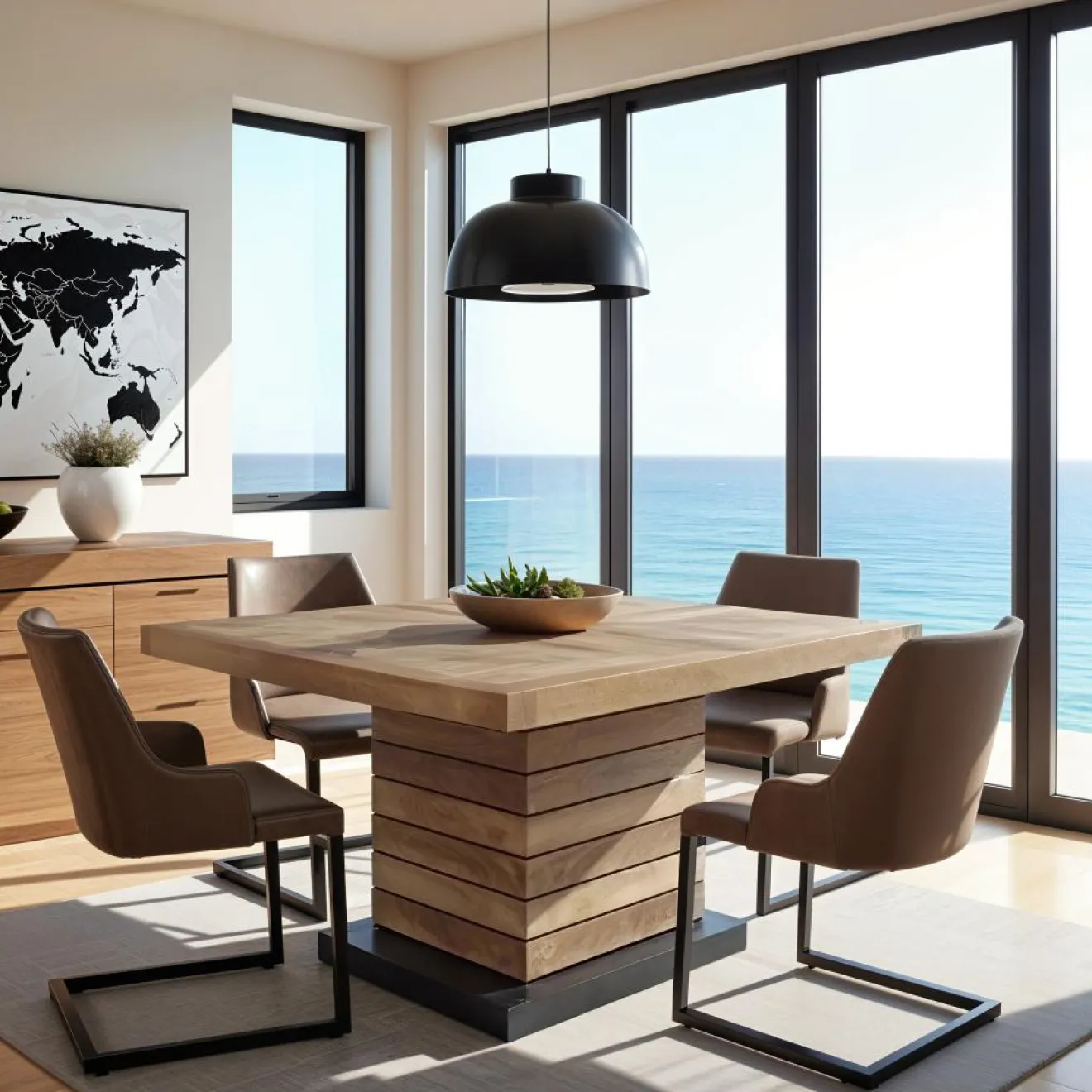 Au centre, un système d’extension permet d’accueillir rapidement jusqu’à 8 convives. Son impressionnant piètement central, réalisé en bois de manguier ajouré, lui confère une véritable personnalité et apportera charme et chaleur à votre intérieur. Il offrira également un confort d’assise optimal à vos invités. Imaginez une suspension en forme d’éventail aux larges pales en bois pour créer une ambiance exotique et raffinée.